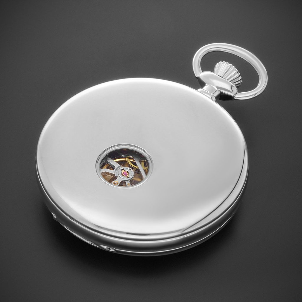 Originálne je umiestnené aj okienko pre fungujúci mechanický strojček, ktoré odhaľuje zadnú stranu puzdra. Páni ocenia ciferník s dvojitými tlačenými indexmi doplnený jemnou minútovou stupnicou. Klasický vzhľad vreckových hodiniek dopĺňajú klasické lopatkové ručičky. Mechanický kaliber 2650SS (pochrómovaný) má frekvenciu 21 600 A/h a rezervu náťahu až 30 hodín.