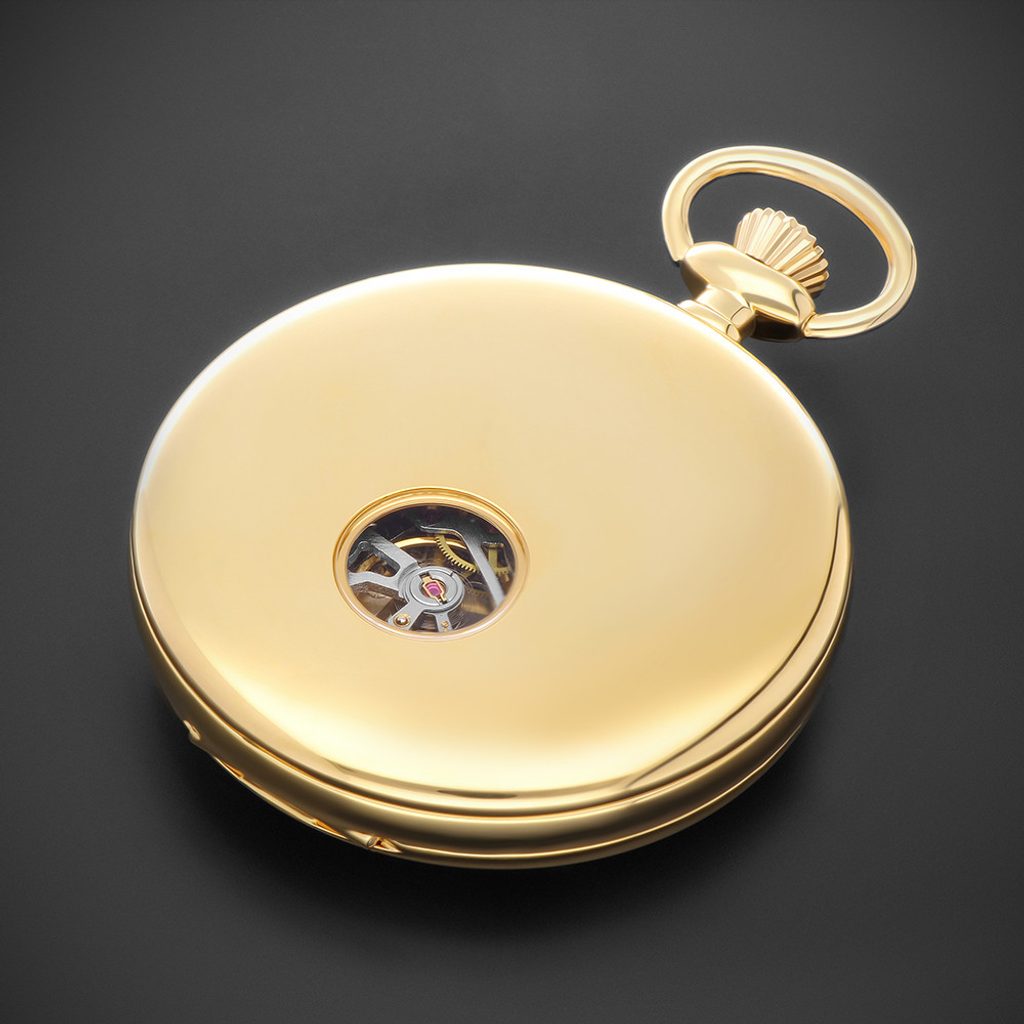Originálne je umiestnené aj okienko pre fungujúci mechanický strojček, ktoré odhaľuje zadnú stranu puzdra. Páni ocenia ciferník s dvojitými tlačenými indexmi doplnený jemnou minútovou stupnicou. Klasický vzhľad vreckových hodiniek dopĺňajú klasické lopatkové ručičky. Mechanický kaliber 2650SS (pochrómovaný) má frekvenciu 21 600 A/h a rezervu náťahu až 30 hodín.