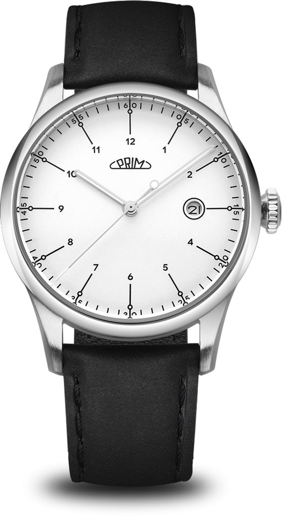 Klasický a čistý vzhľad podčiarkuje tradičný retro ciferník s indexmi a číslicami značky PRIM. Na pozícii 3 hodín sa nachádza okienko s dátumovkou v netradičnom minimalistickom okrúhlom tvare, ktoré dopĺňa sekundovú ručičku a vytvára harmóniu v celkovom dizajne hodiniek.