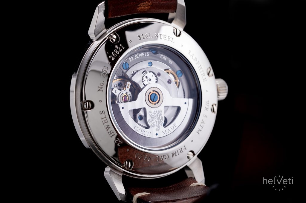 Model PRIM PAVOUK 40 C 98-226-340-00-1 sa vyznačuje aj ciferníkom so zložitým reliéfom a vyvýšenými indexmi, ktoré sú rovnako ako ručičky buď v kove puzdra, alebo v ružovom zlate. Puzdro je v základnej verzii vyrobené z ušľachtilej ocele, ale na požiadanie môže byť vyrobené aj zo žltého, bieleho alebo ružového zlata. Zákazníci si môžu vybrať aj zo štyroch farebných variantov ciferníka. Hodinky sú vybavené strojčekom vlastnej výroby s manuálnym naťahovaním PRIM kalibru 98.00.