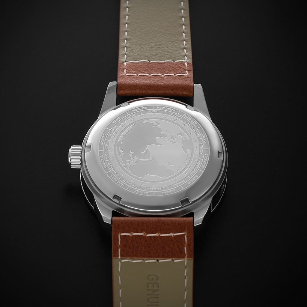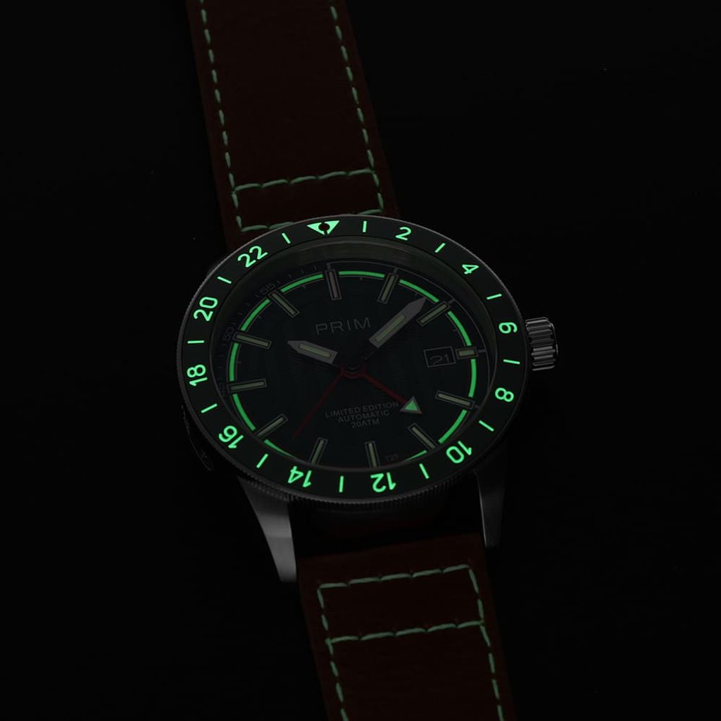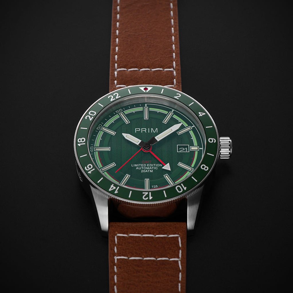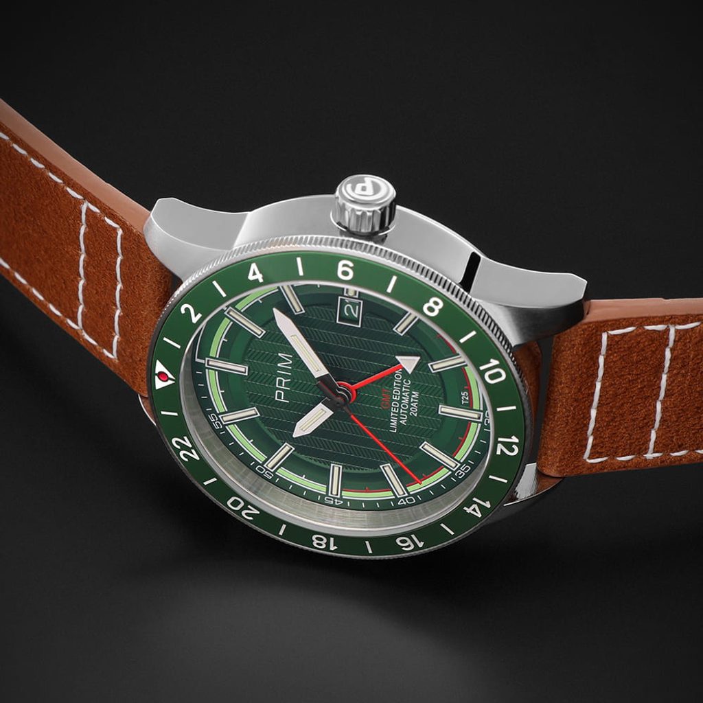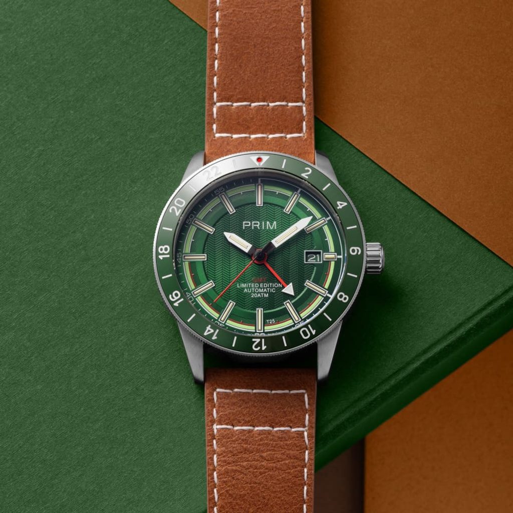 Pýšia sa puzdrom z nehrdzavejúcej ocele s kvalitne spracovaným hnedým koženým remienkom, zelený ciferník zdobí luminiscenčný prstenec Super-LumiNova®, zatiaľ čo červená ručička indikuje funkciu GMT a umožňuje ľahko prehliadnuť údaj o druhom časovom pásme.