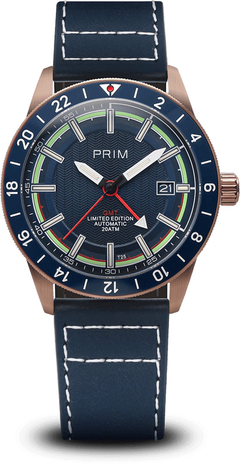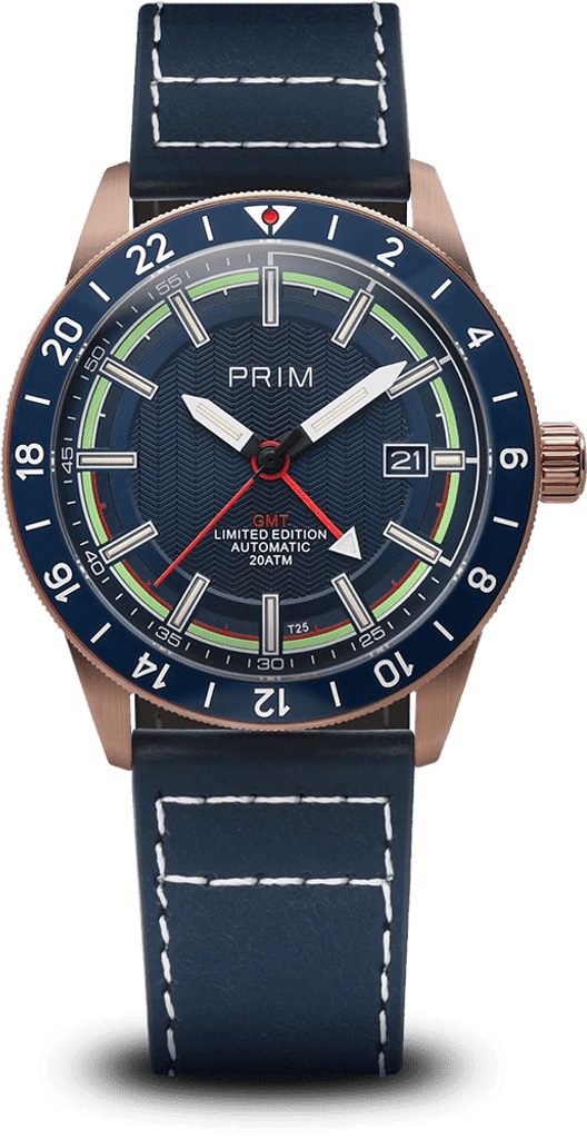 Pýšia sa puzdrom z ušľachtilej ocele s povrchovou úpravou z ružového zlata a kvalitne spracovaným modrým koženým remienkom. Modrý ciferník zdobí luminiscenčný prstenec Super-LumiNova®, zatiaľ čo červená ručička indikuje funkciu GMT a umožňuje ľahko prehliadnuť údaj o druhom časovom pásme.