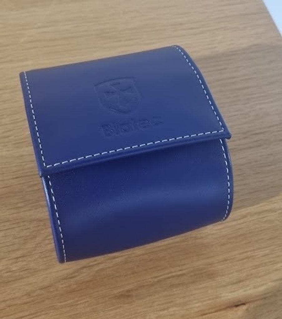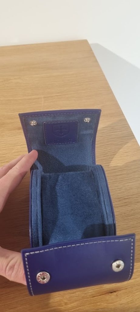 Puzdro je vyhotovené v kombinácii modrej kože a luxusného béžového semišového vnútra, na ktorom je vyrazené logo značky. Puzdro má odnímateľnú podložku pod hodinky, zabezpečenú bočnými sponami.