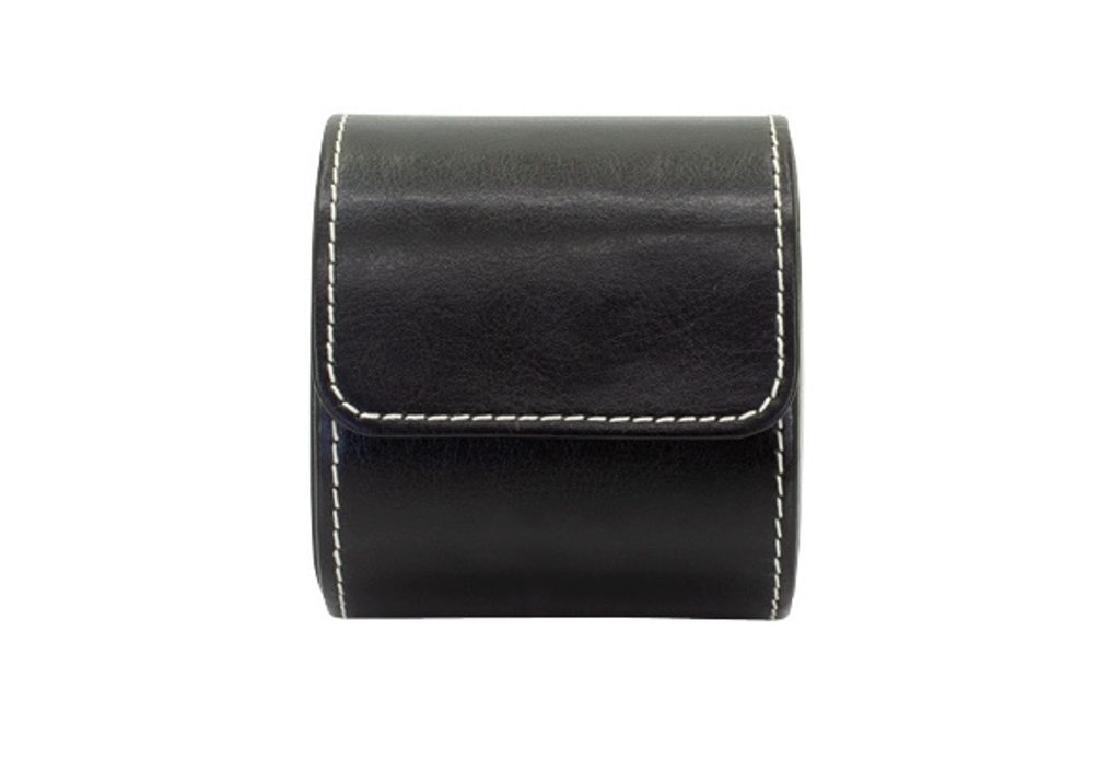Praktické cestovné puzdro Friedrich Lederwaren Bond 20116-2 pre 1 hodinky. Vyrobené z čierneho syntetického materiálu. Vnútorná strana puzdra a šitie je svetlomodré.