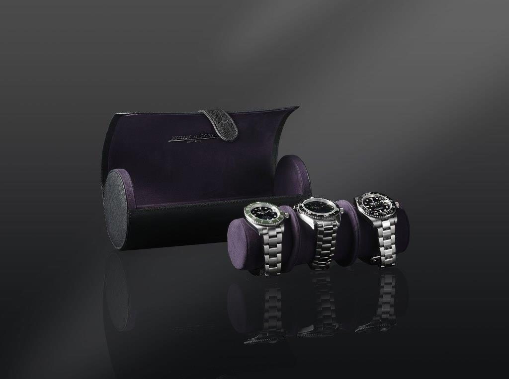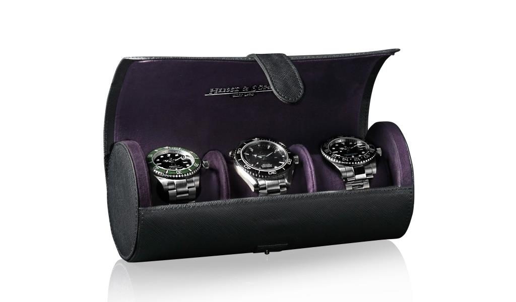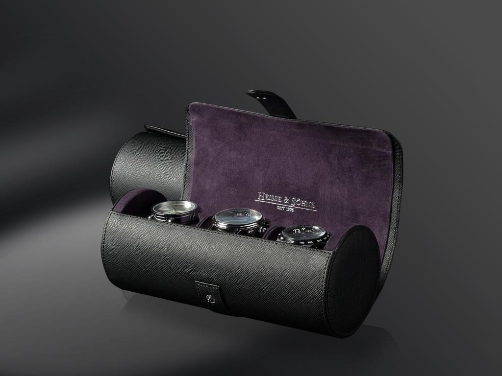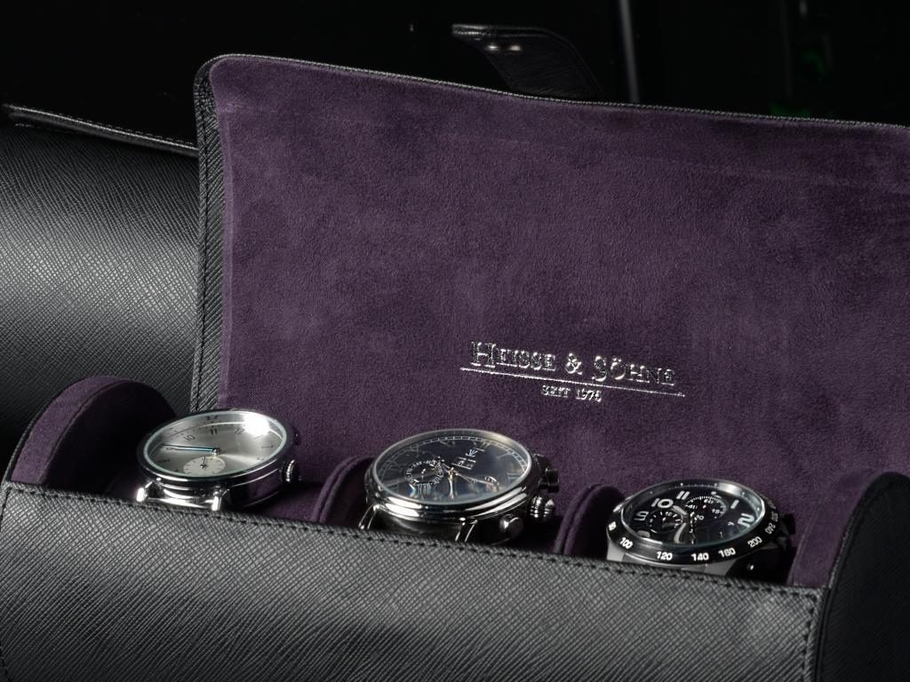 Elegantné puzdro na hodinky Heisse & Söhne Rondo 3 70019-148 pre 3 hodinky. Vyrobené z kvalitnej syntetickej čiernej kože s fialovým velúrovým vnútrom.