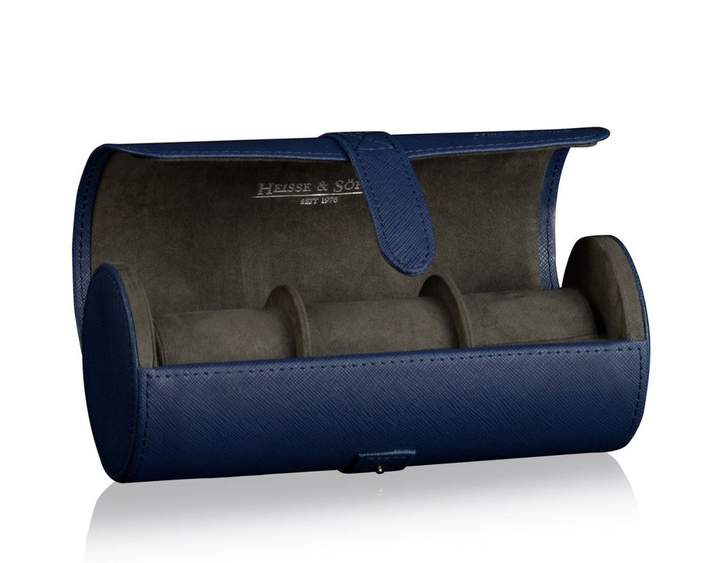 Elegantné puzdro na hodinky Heisse & Söhne Rondo 3 70019-121 pre 3 hodinky. Vyrobené z vysokokvalitnej syntetickej modrej kože so sivým velúrovým vnútrom.