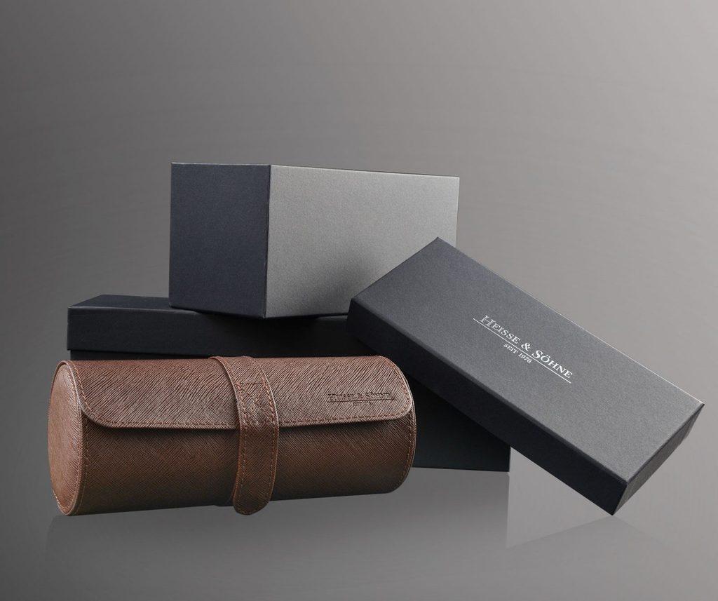 Elegantné puzdro na hodinky Heisse & Söhne Rondo 3 70019-96 pre 3 hodinky. Je vyrobený z kvalitnej syntetickej kože hnedej farby a svetlosivého velúru.