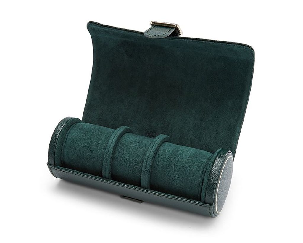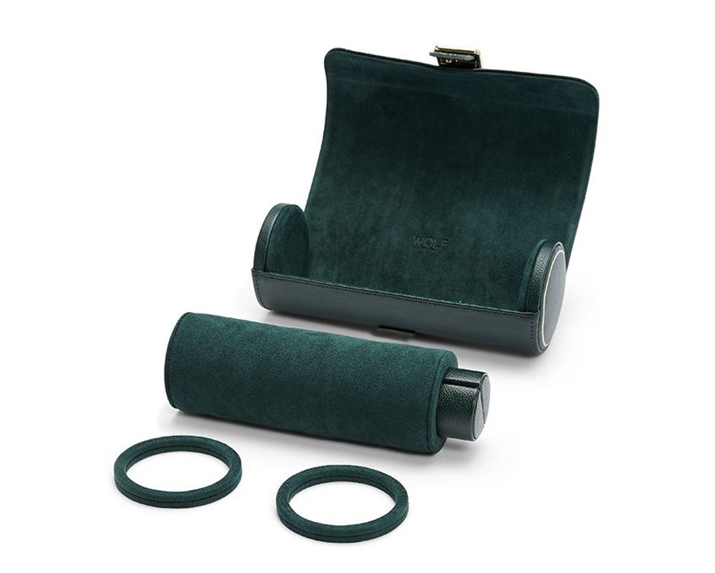 Wolf British Racing Green 792941 je veľmi kvalitne spracované puzdro z jemnej štruktúrovanej kože a so zamatovou podšívkou, zapínanie na magnet. Na vnútornom vankúši sú krúžky, ktoré znemožnia, aby sa jednotlivé hodinky vzájomne dotýkali. Zároveň sa vo vnútornom vankúši ukrýva malé puzdro, napr. na manžetové gombíky.