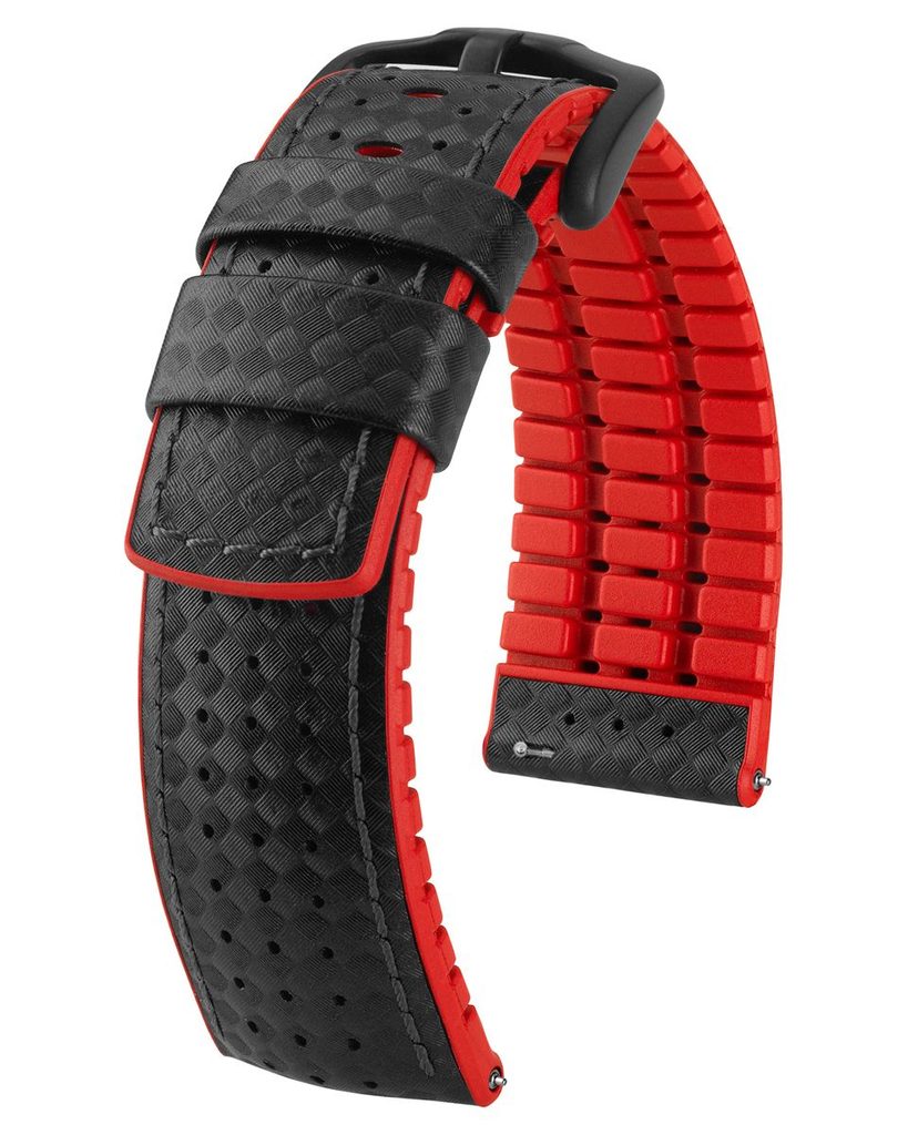 Zatiaľ čo vrchná časť remienka je vyrobená z odolnej talianskej teľacej kože, spodná časť má farebné gumové jadro Hirsch Premium Caoutchouc, ktoré poskytuje primerané pohodlie a zároveň zdôrazňuje športový dizajn. Neoddeliteľnou súčasťou dizajnu je aj kvalitná pracka z nehrdzavejúcej ocele s čiernym povrchom.