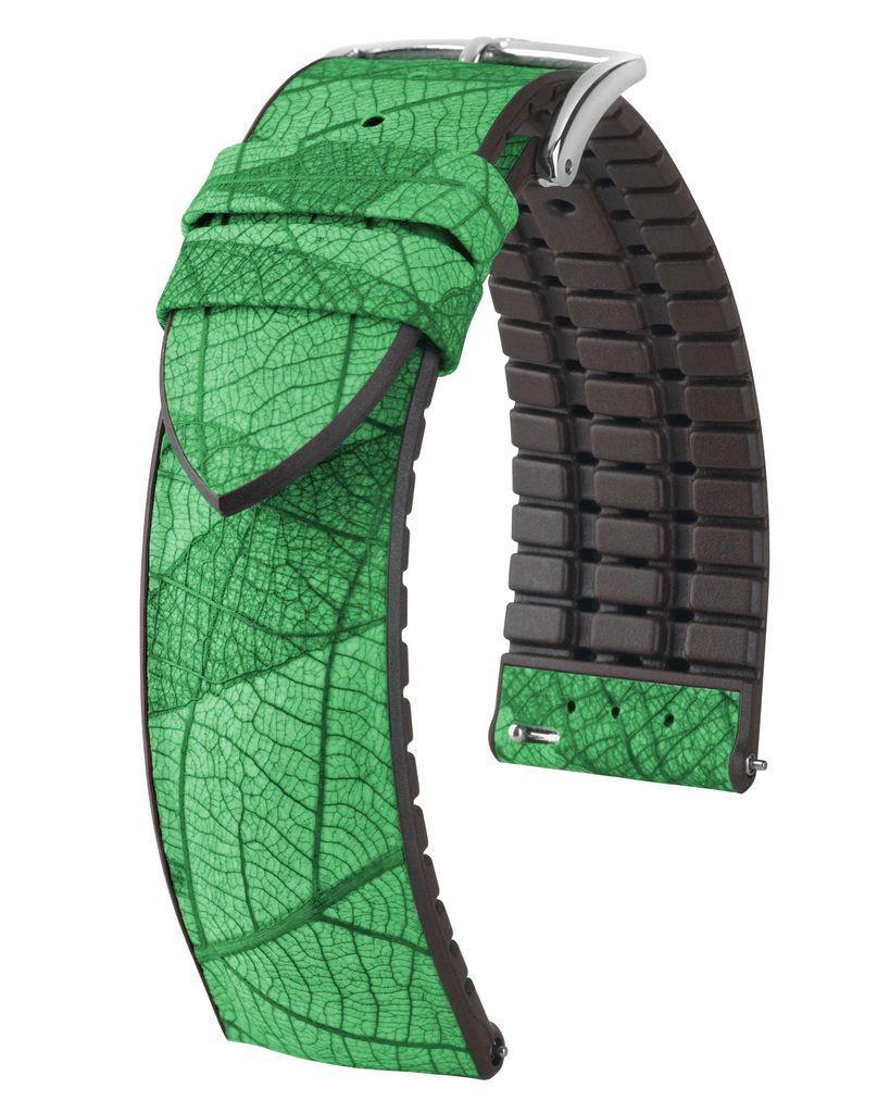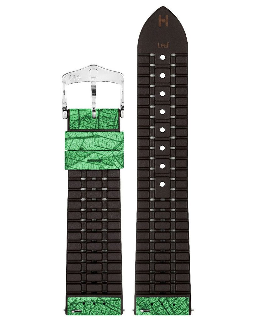 Na rozdiel od iných remienkov sa kolekcia Leaf môže pochváliť tým, že je vyrobená z listov vďaka jedinečnému viacvrstvovému procesu, ktorý vyvinula značka Hirsch. Jednotlivé časti sa farbia a ručne nanášajú na podkladový materiál náramku pomocou jedinečnej technológie. Rad Leaf tak kráča v stopách obnoviteľných prírodných materiálov. Pokiaľ ide o podšívku, hlavnú úlohu tu zohráva jadro Premium Caoutchouc, vďaka ktorému je remienok nielen pohodlný, ale aj pevný a odolný voči vode.