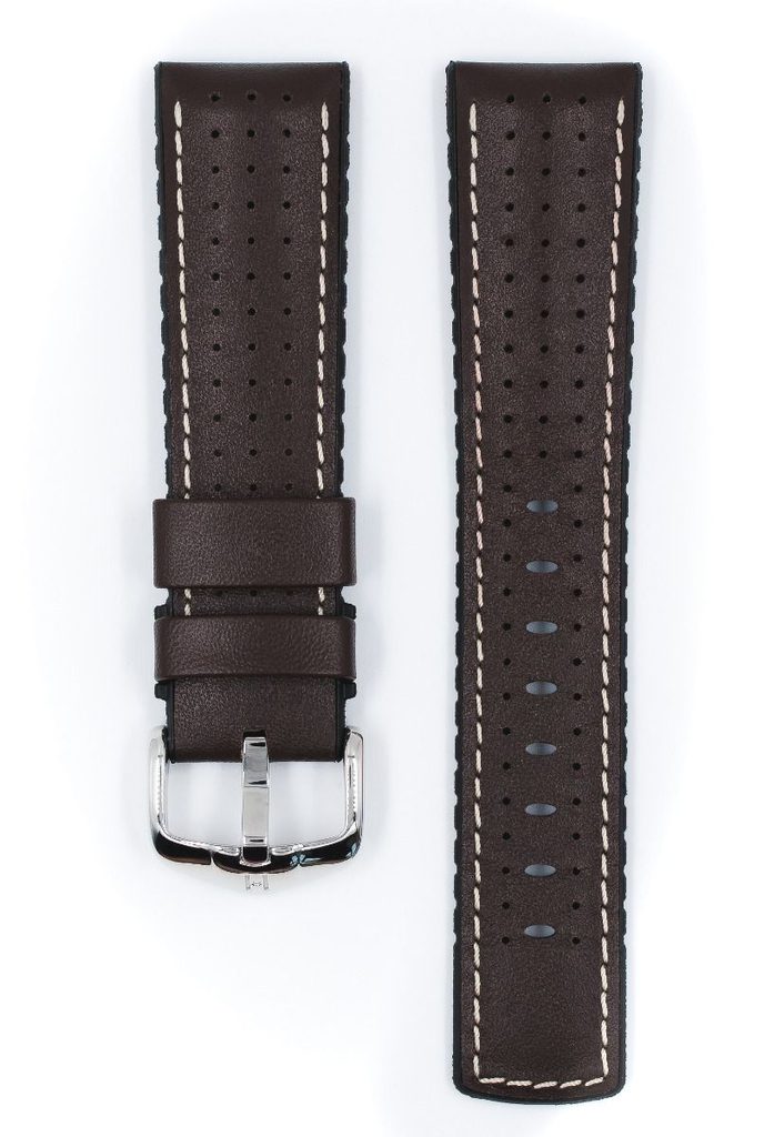 Hnedý športový remienok Hirsch Tiger L z teľacej kože najvyššej kvality s perforáciou a bielym prešívaním. Spodná časť remienka je vyrobená z prvotriednej gumy, ktorá sa dokonale prispôsobí každému tvaru zápästia. Vďaka špeciálnej štruktúre sa popruh nedotýka pokožky, čím zabezpečuje nepretržité vetranie a odvod vlhkosti.