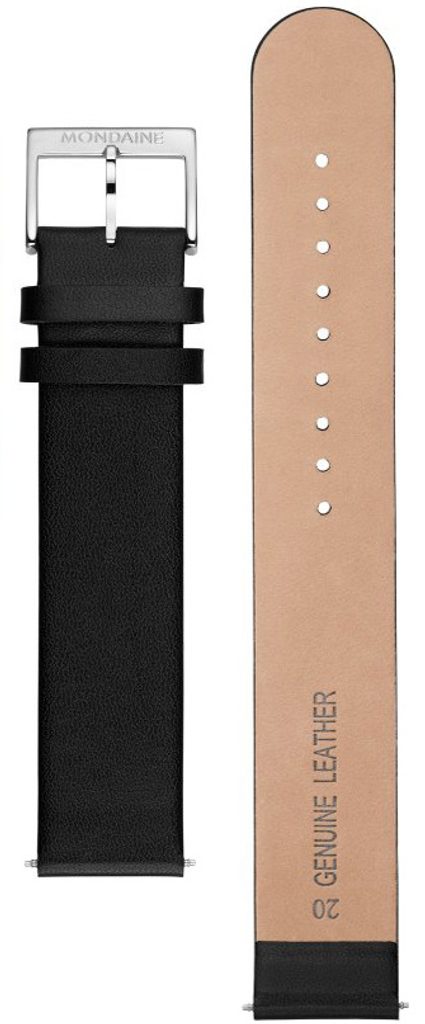 Originálny remienok Mondaine so šírkou 20 mm z hladkej čiernej kože v predĺženej verzii.