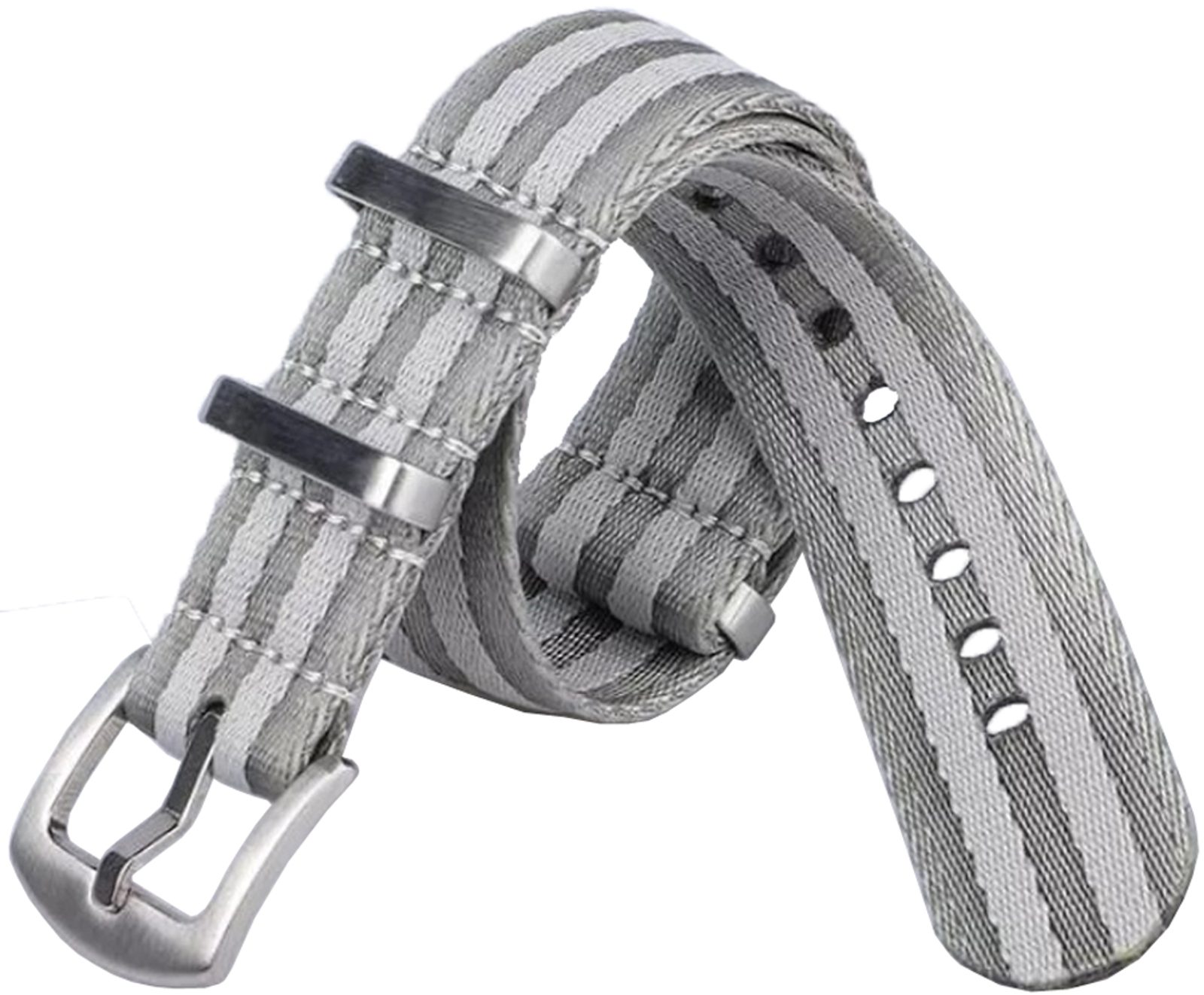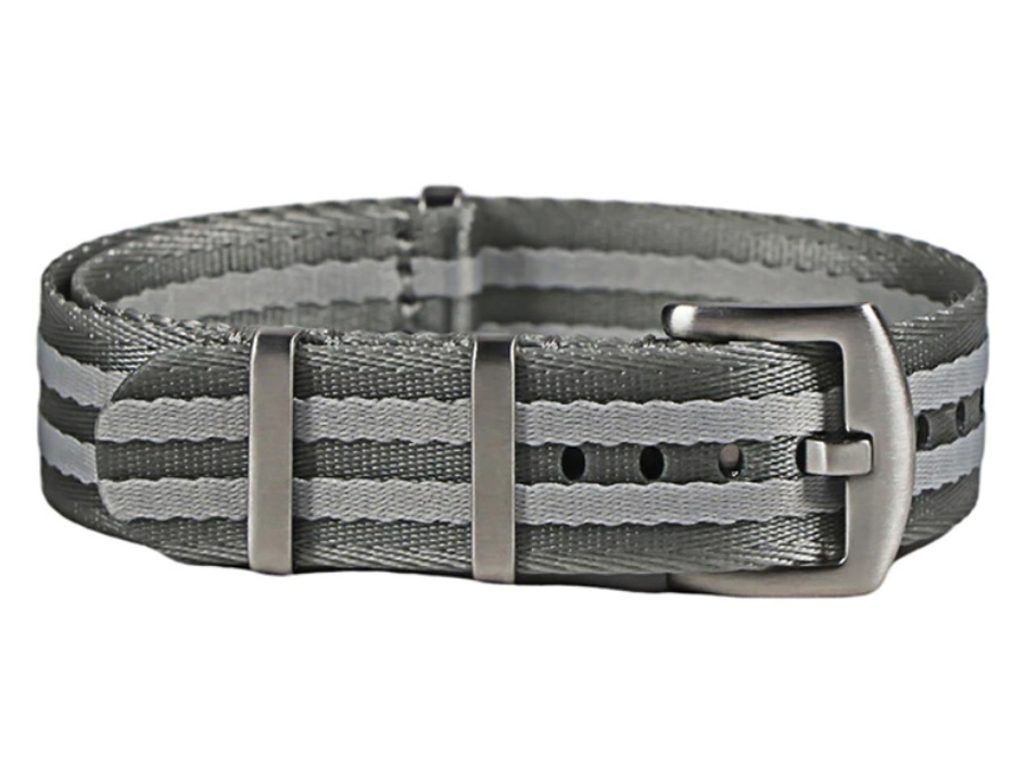 Športový remienok NATO so šírkou 22 mm z materiálu NATO so sivo-striebornými pruhmi.