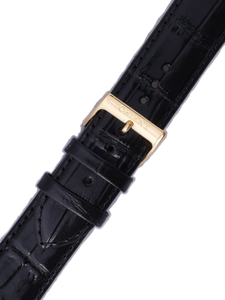 Originálny čierny kožený remienok Orient so šírkou 22 mm sa môže pochváliť praktickou sponou zlatej farby a štýlovým dizajnom. Jeho kvalitné spracovanie a jedinečný vzhľad zároveň dodajú vašim hodinkám nádych elegancie.