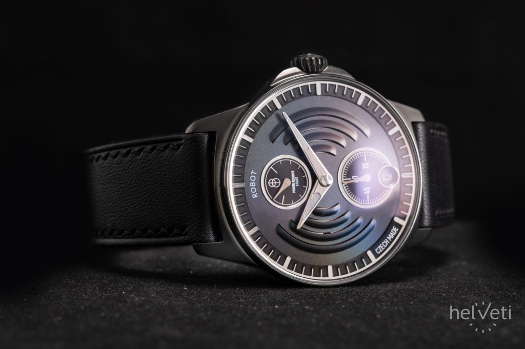 Model Robot Aerodynamic Black Nickel má čierny ciferník s výrazným rebrovaním po stranách, vybavený kontrastnou minútovou stupnicou po vonkajšom obvode a dvoma priehľadnými subciferníkmi. Ručička na 12. hodine patrí rezerve náťahu, ktorá dosahuje úctyhodných 8 dní, zatiaľ čo ručička na 6. hodine je mimostredová sekundová ručička so zabudovanou dátumovkou. Celok vhodne dopĺňajú výrazné frézované ručičky v tvare kvapky, ručne vyplnené luminiscenčnou vrstvou pre lepšiu čitateľnosť za zhoršených svetelných podmienok.