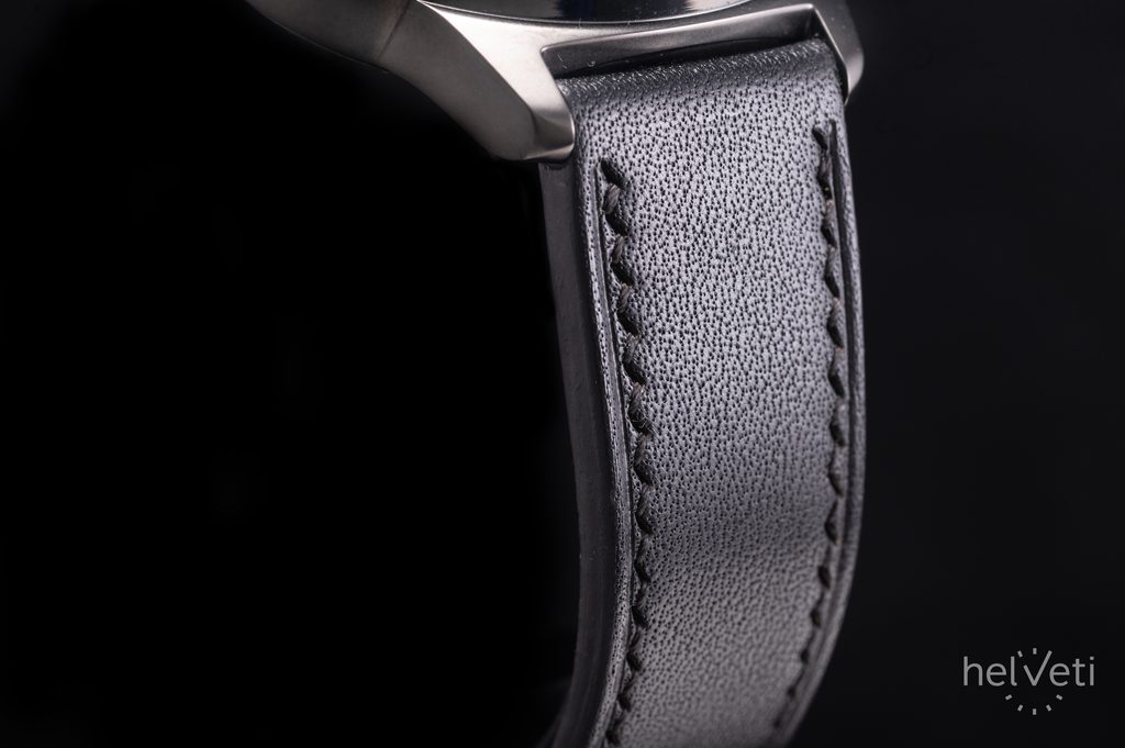 Pieskované puzdro hodiniek s čiernou PVD povrchovou úpravou, vyrobené z titánu triedy 5, dopĺňa na ruke veľmi pohodlný kožený remienok zakončený tŕňovou sponou.