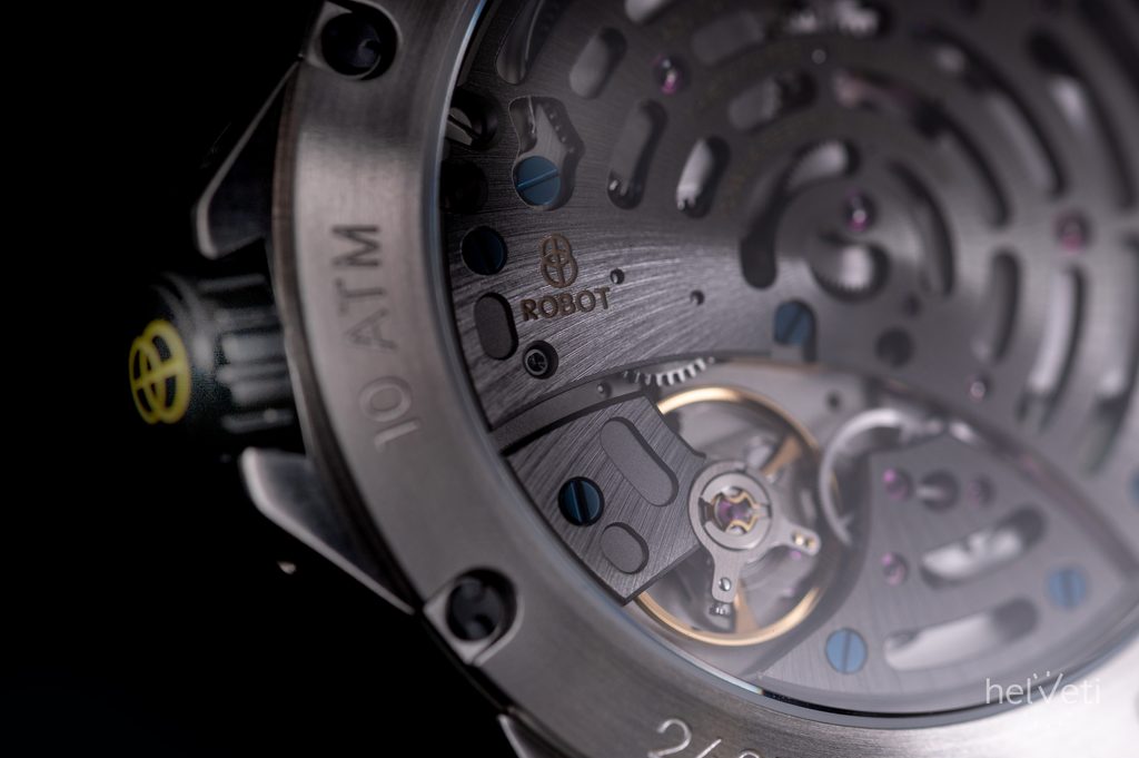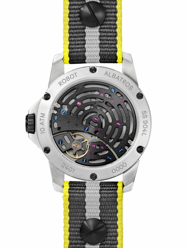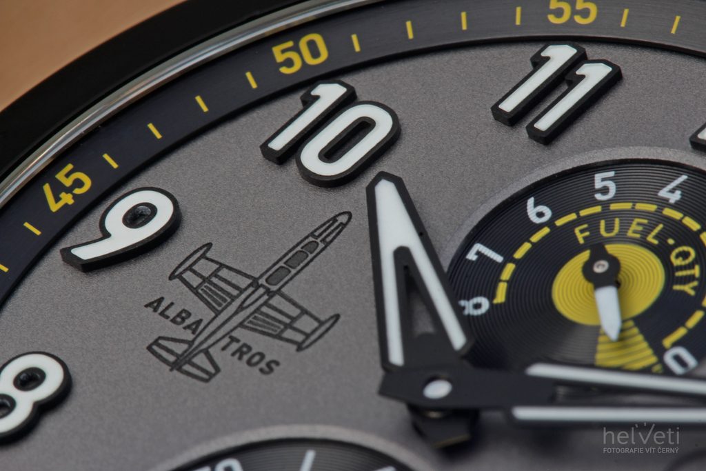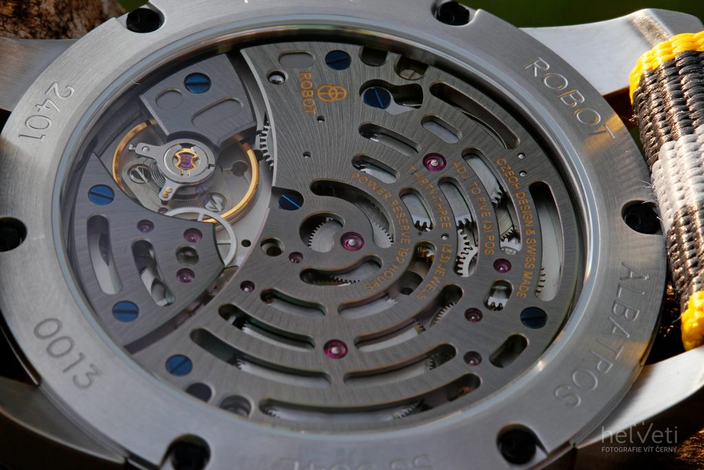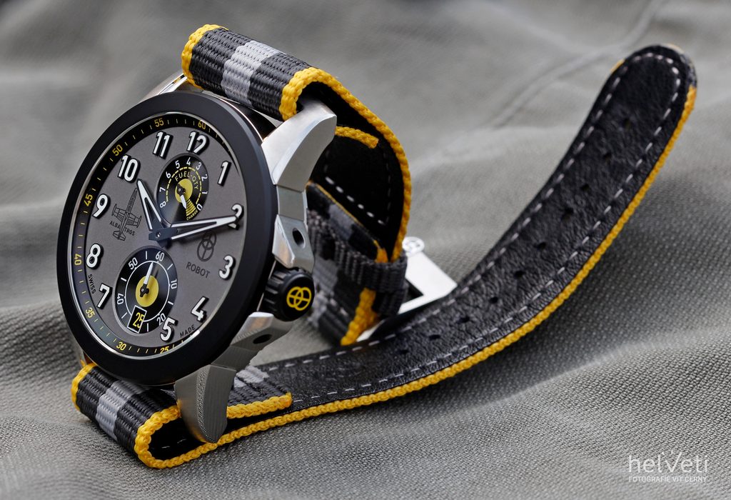 Model Robot Albatros Silver má sivý ciferník s prúdovými motormi zvýraznený žltými prvkami, opatrený kontrastnými číslicami na pozíciách hodín a dvoma priehľadnými subciferníkmi. Ukazovateľ na 12. hodine patrí rezerve náťahu, ktorá dosahuje úctyhodných 8 dní, zatiaľ čo ukazovateľ na 6. hodine je mimostredová sekundová ručička s vloženou dátumovkou, pri ktorej poteší použitie tmavého pozadia.