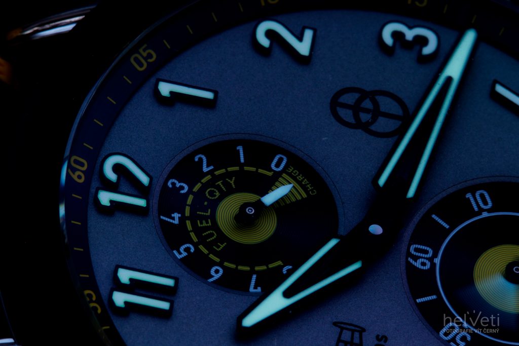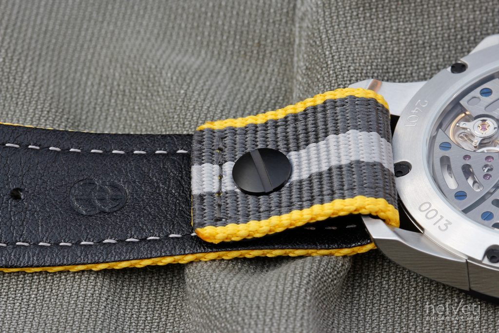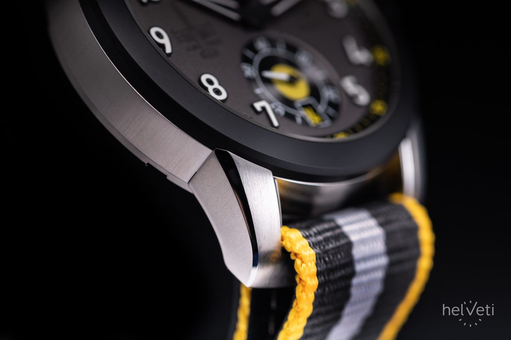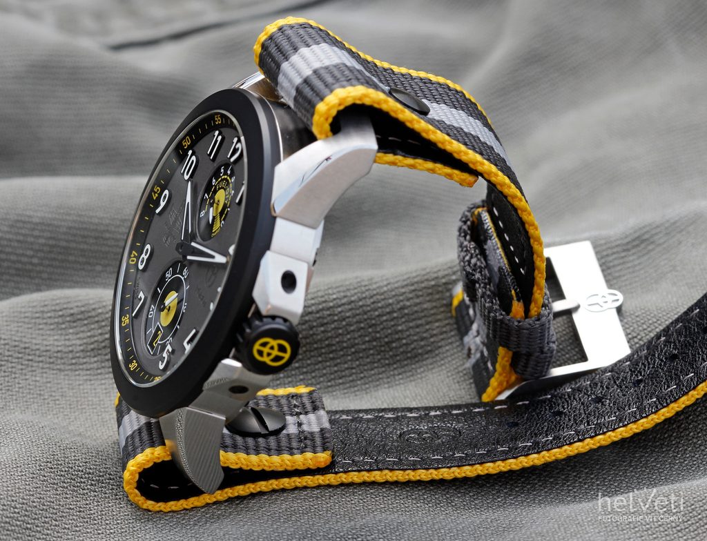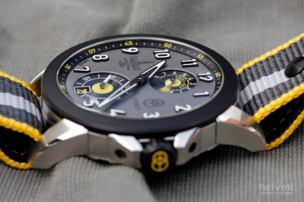 Puzdro hodiniek vyrobené z ocele 904L dopĺňa keramická luneta a remienok lemovaný textilnou kožou v odtieňoch sivej a žltej farby. Hodinky potešia detailmi v podobe skrutkovacej korunky inšpirovanej tvarom leteckého motora, ktorú chránia prvky v tvare katapultovacích sedadiel pilotov. Zaujímavosťou je mechanizmus, vďaka ktorému korunka po zaskrutkovaní do puzdra skončí vždy v rovnakej polohe. Za zmienku stoja aj špeciálne navrhnuté ručičky, ktoré v horizontálnej polohe pripomínajú obrys krídla lietadla.