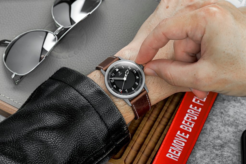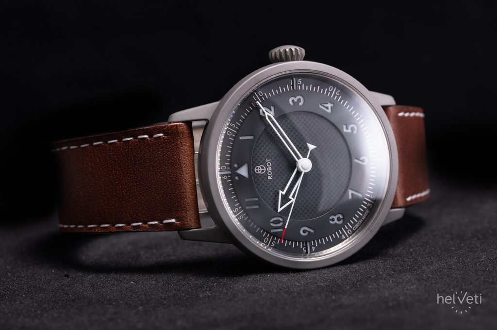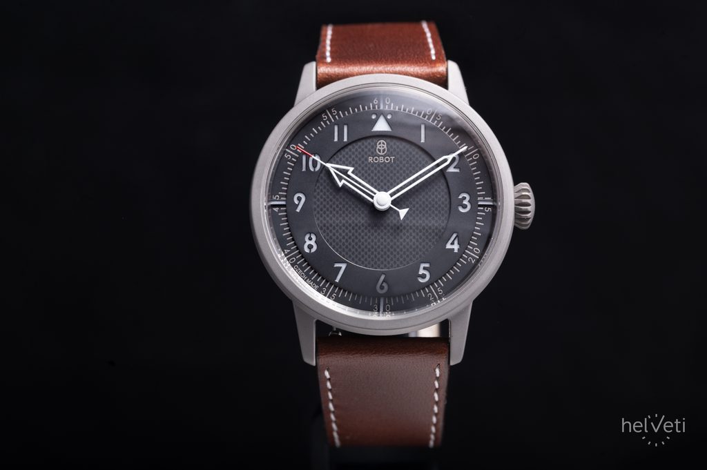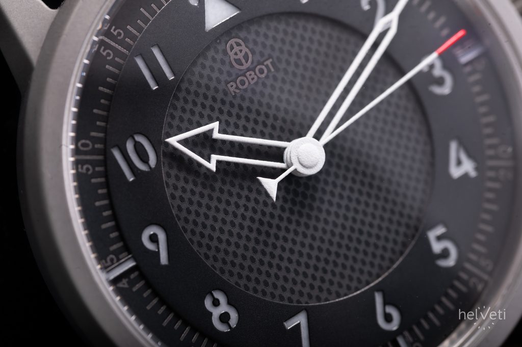 Robot FliegerFriday x Micro Praha L.E. prináša jedinečný dizajn inšpirovaný pilotnými hodinkami. Má dokonale čitateľný čierny viacvrstvový ciferník, doplnený výraznými skeletonizovanými ručičkami. Hodinové pozície sú osadené veľkými číslicami a pekným detailom je aj minútová stupnica, ktorá sa tiahne po obvode ciferníka. Ručičky a indexy sú vyplnené luminiscenciou pre lepšiu čitateľnosť za zhoršených svetelných podmienok.