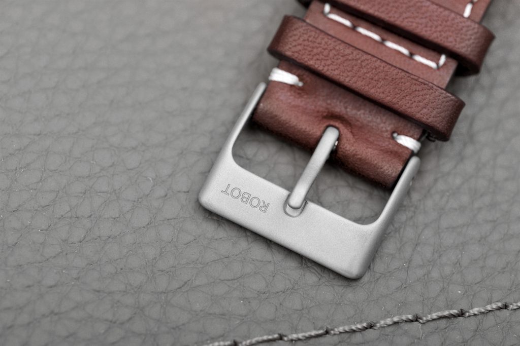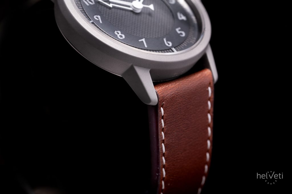 Oceľové puzdro hodiniek s matnou pieskovanou povrchovou úpravou a korunkou s ľahkým uchopením dopĺňa hnedý remienok s výrazným kontrastným prešívaním, zakončený tŕňovou sponou. Remienok je vybavený rýchloupínacím systémom, vďaka ktorému je každá výmena veľmi jednoduchá bez použitia náradia.