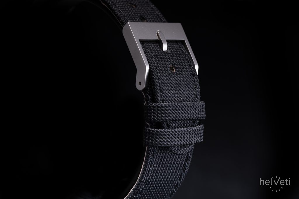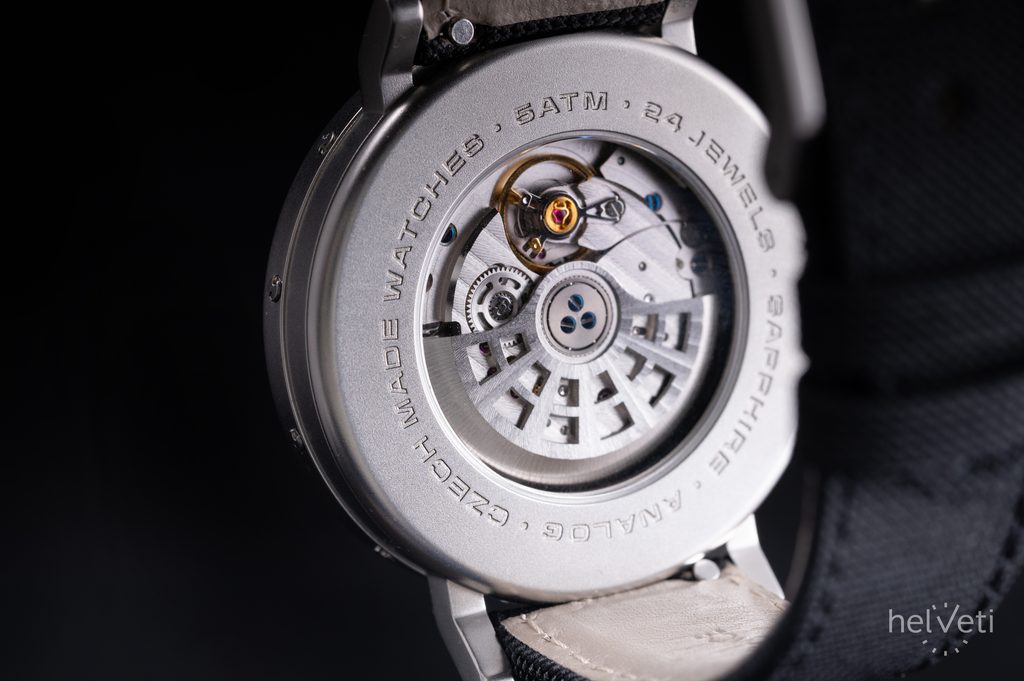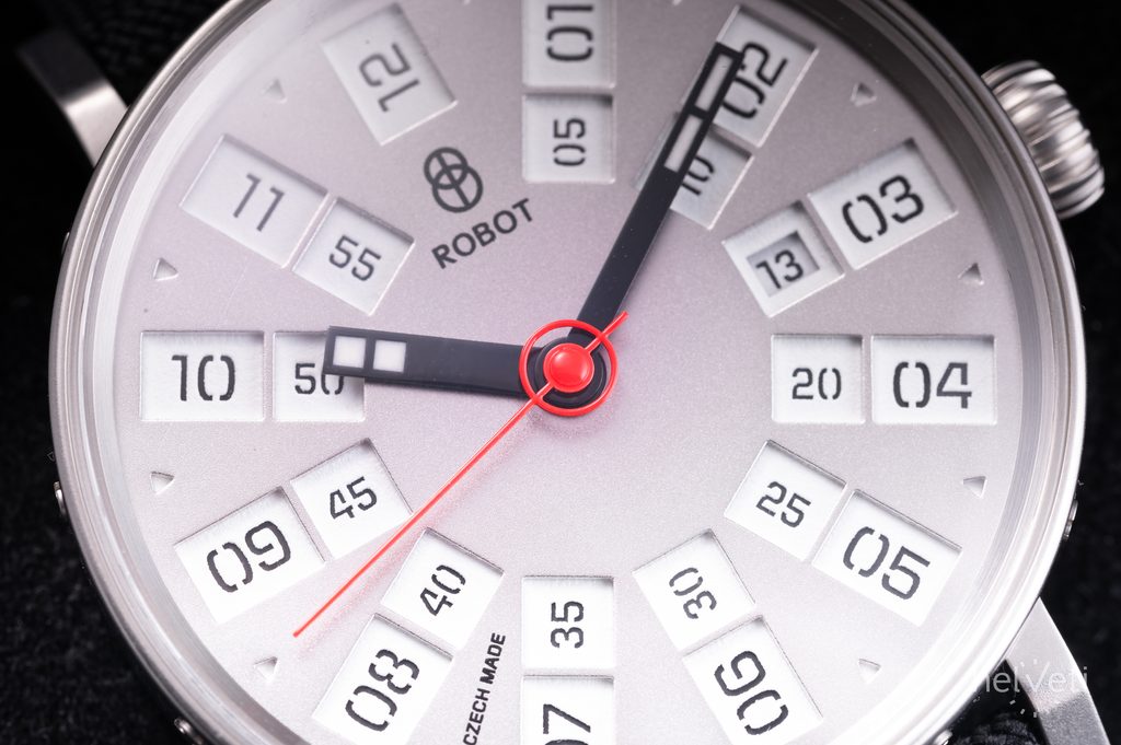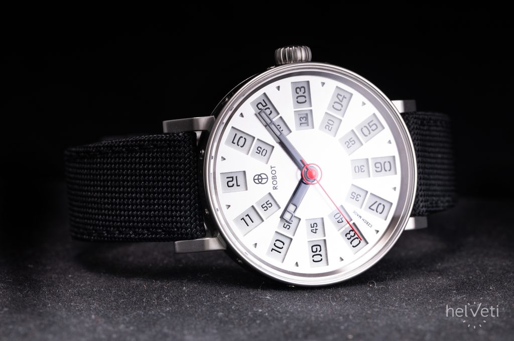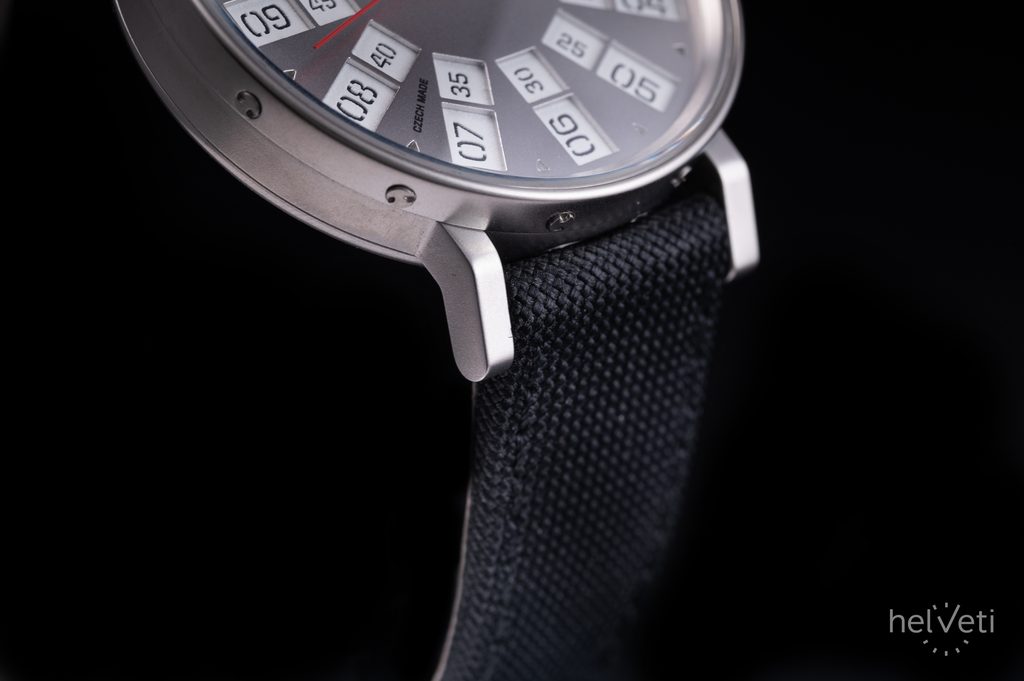 Oceľové puzdro hodiniek dopĺňa čierny textilný remienok lemovaný kožou zakončený tŕňovou sponou. Remienok je vybavený rýchloupínacím systémom, vďaka ktorému je prípadná výmena veľmi jednoduchá bez použitia náradia. Puzdro je zaujímavé svojou konštrukciou - strojček je osadený zo strany ciferníka a boky puzdra zdobia na mieru vyrobené skrutky s odkazom na logo Robot.