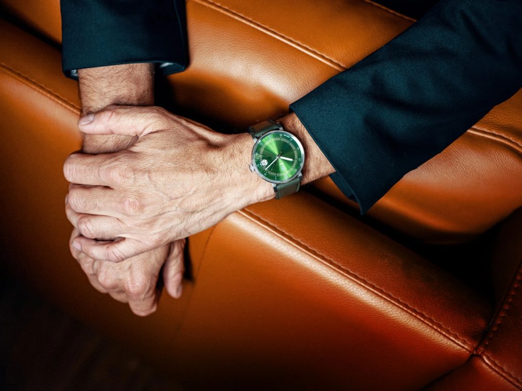 Oceľové puzdro hodiniek s tryskaným povrchom dopĺňa ručně robený zelený kožený remienok zakončený tŕňovou sponou.