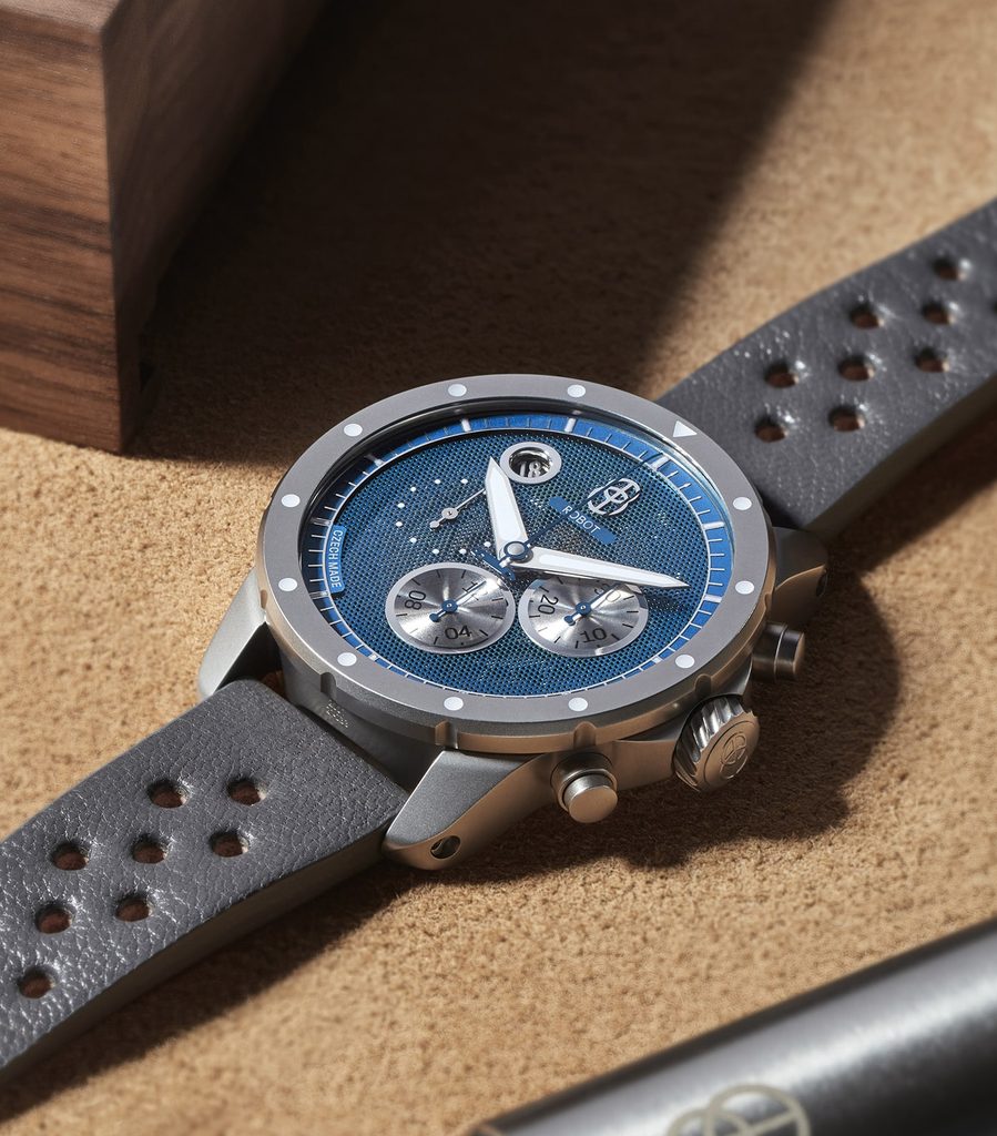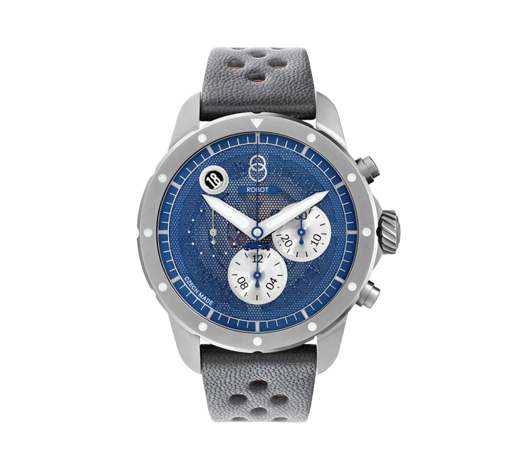 Robot Minor Le Mans Blue v ľahkom a odolnom titánovom puzdre zaujme originálnym pretekárskym dizajnom, ktorému dominuje ciferník s 3 462 miniatúrnymi perforáciami, ktoré umožňujú nahliadnuť do srdca automatického hodinkového strojčeka La Joux-Perret.