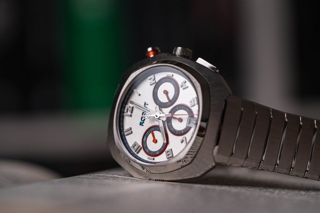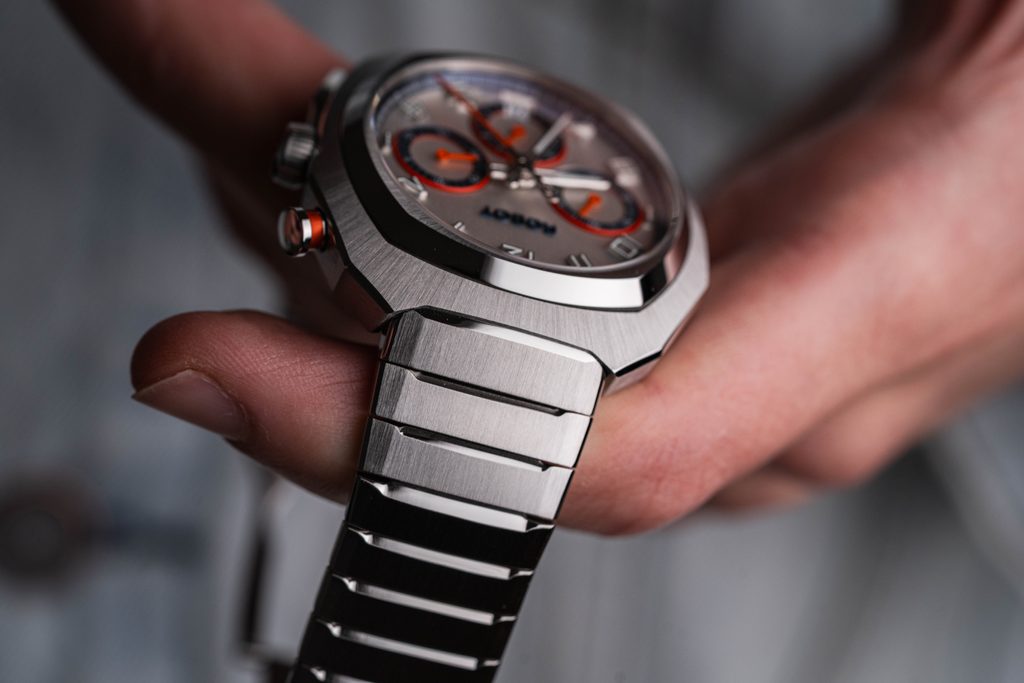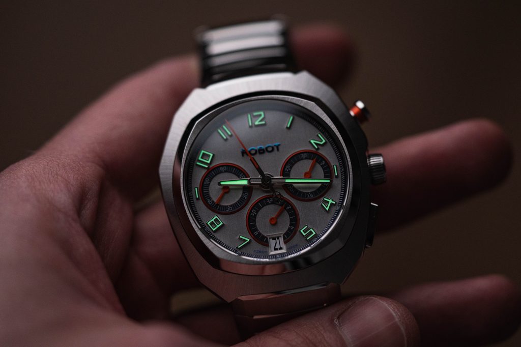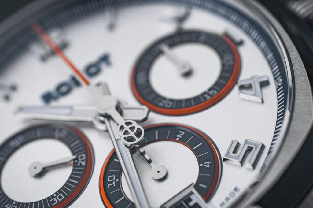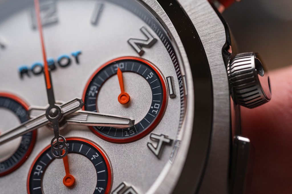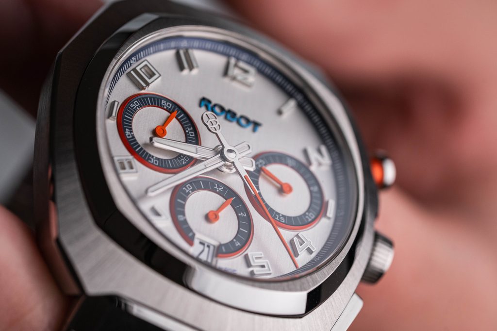 Najvýraznejším prvkom modelu je samotné puzdro. Má vertikálne rezaný ciferník v striebornej farbe, na ktorom vyniknú reliéfne subciferníky evokujúce oči robota a reliéfne logo značky. Abecedné indexy s výplňou Super-LumiNova®zaisťujú dokonalú čitateľnosť aj za zhoršených svetelných podmienok. Frézované trojrozmerné, ručne leštené ručičky dodávajú ciferníku spolu s ostatnými prvkami hĺbku a pôsobivý detail.