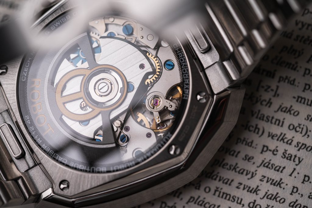 Hodinky poháňa špeciálne upravený švajčiarsky mechanický strojček s automatickým naťahovaním - kaliber ROBOT Boutique R11242 s rezervou chodu 55 hodín. Okrem zobrazenia času ponúka aj funkciu dátumu na pozícii 6 hodín a funkciu stopiek. Na strojček sa dá pozerať cez priehľadné vieko se zafírom.
