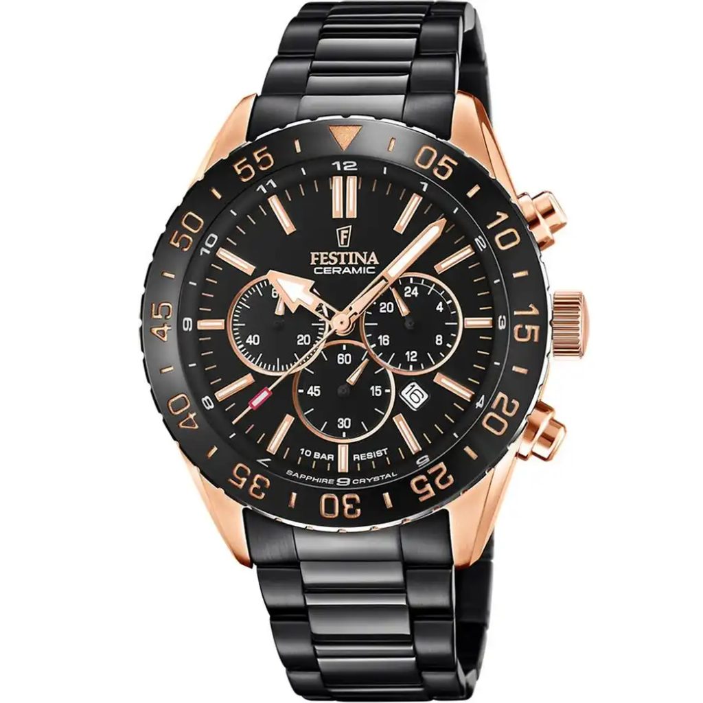 Športové hodinky pre mužov Festina Ceramic 20578/1 s chronografom. Hodinky majú puzdro z vysokokvalitnej nehrdzavejúcej ocele s povrchovou úpravou PVD v ružovom zlate.Na puzdro nadväzuje náramok tiež z nehrdzavejúcej ocele s čiernou povrchovou úpravou PVD. Kruhový ciferník dopĺňajú jednoduché indexy a ručičky s luminiscenčnou vrstvou.