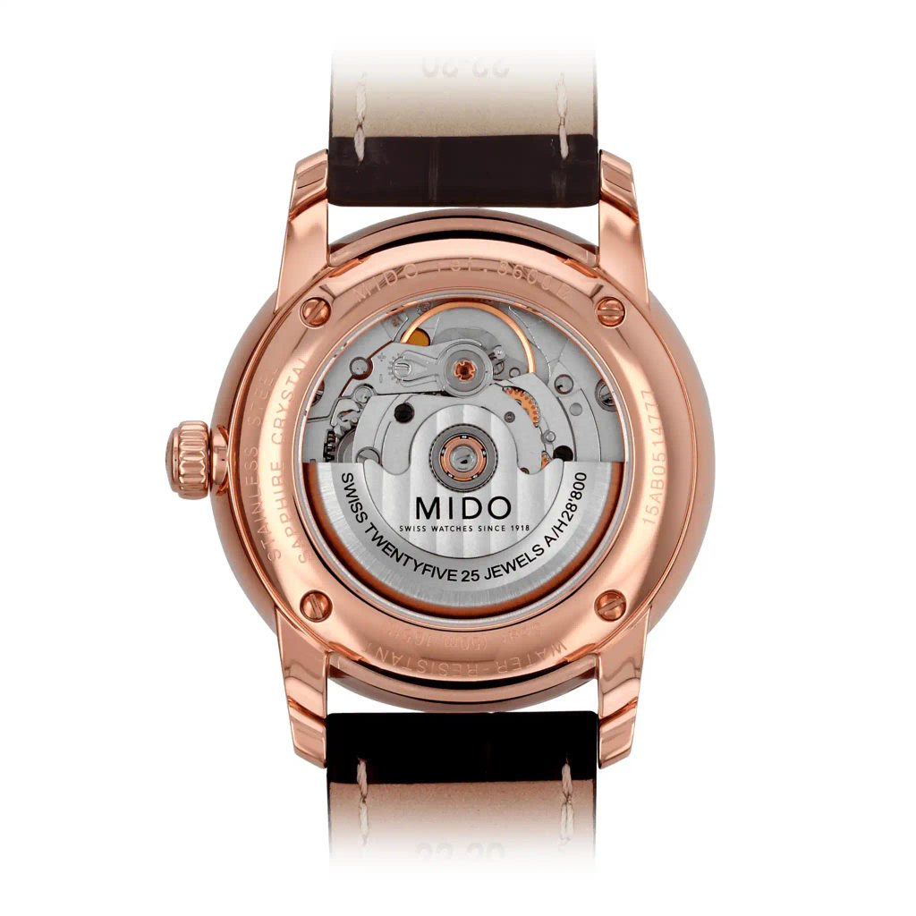 Hodinky Mido M8600.2.21.8 majú puzdro z nehrdzavejúcej ocele 316L s povrchovou úpravou ružovým zlatom PVD, ktoré vhodne dopĺňa kožený remienok. V puzdre spoľahlivo tiká švajčiarsky mechanický strojček Mido Caliber 80 (na báze ETA C07.611) s automatickým naťahovaním. Pracuje pri frekvencii 21 600 polfrekvencií za hodinu, má 25 drahokamov a predovšetkým predĺženú rezervu chodu na 80 hodín. Činnosť tohto stroja možno pozorovať cez priehľadnú matricu. Na pozícii 4-5 hodín sa nachádza praktický ukazovateľ dátumu.