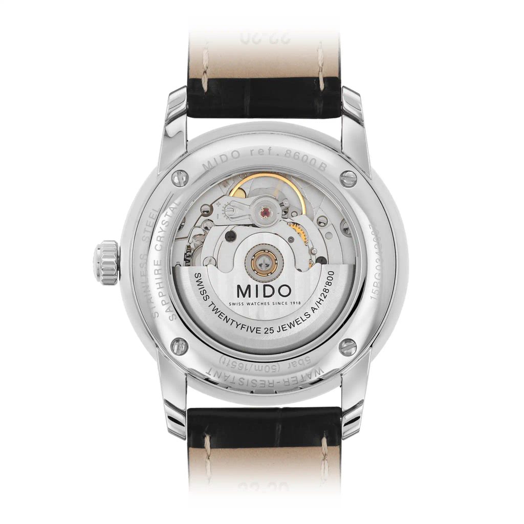 Hodinky Mido M8600.4.21.4 majú puzdro z nehrdzavejúcej ocele 316L, ktoré je doplnené koženým remienkom. Vo vnútri puzdra spoľahlivo tiká švajčiarsky mechanický strojček Mido Caliber 80 (na báze ETA C07.611) s automatickým naťahovaním. Pracuje pri frekvencii 21 600 polfrekvencií za hodinu, má 25 drahokamov a predovšetkým predĺženú rezervu chodu na 80 hodín. Činnosť tohto stroja možno pozorovať cez priehľadnú matricu. Na pozícii 4-5 hodín sa nachádza praktický ukazovateľ dátumu.