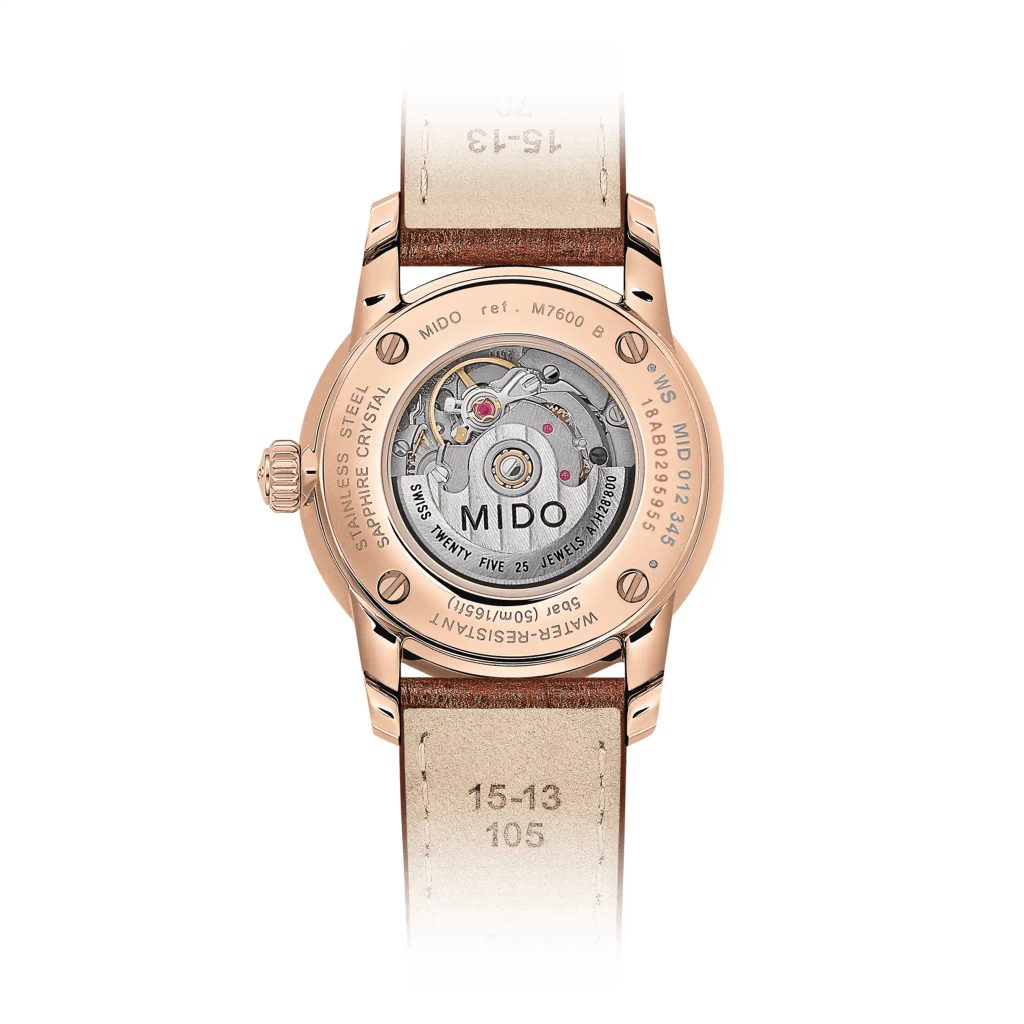 Hodinky Mido M8600.3.15.8 majú puzdro z nehrdzavejúcej ocele 316L s povrchovou úpravou ružovým zlatom PVD, ktoré vhodne dopĺňa kožený remienok. V puzdre spoľahlivo tiká švajčiarsky mechanický strojček Mido Caliber 80 (na báze ETA C07.611) s automatickým naťahovaním. Pracuje pri frekvencii 21 600 polfrekvencií za hodinu, má 25 drahokamov a predovšetkým predĺženú rezervu chodu na 80 hodín. Činnosť tohto stroja možno pozorovať cez priehľadnú matricu. Na pozícii 4-5 hodín sa nachádza praktický ukazovateľ dátumu.