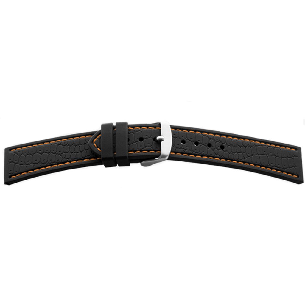 Silikónový remienok BEAR v čiernej farbe so vzorom "croco" a oranžovým prešívaním, so striebornou prackou. Remienok je široký 20 mm pri puzdre a zužuje sa na 18 mm pri pracke.