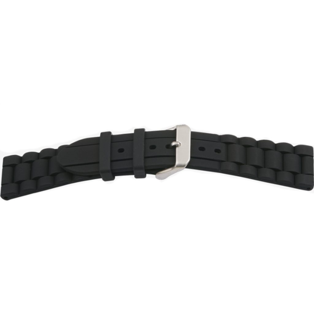 Silikónový remienok BEAR čierny so striebornou sponou. Remienok je široký 18 mm pri puzdre a zužuje sa na 16 mm pri pracke.