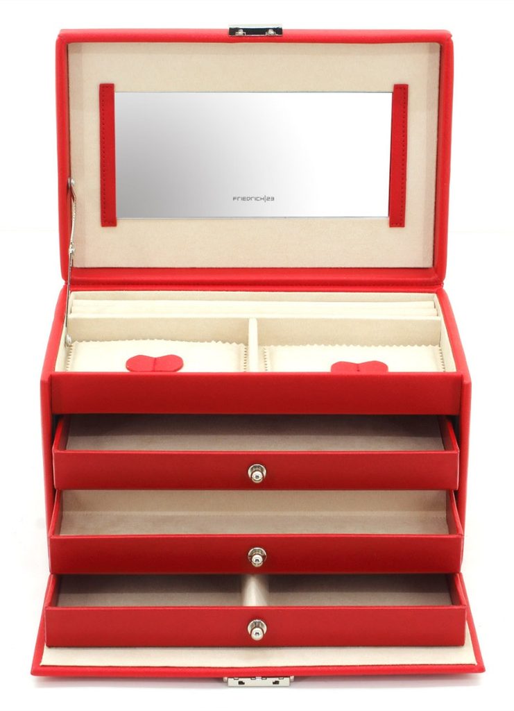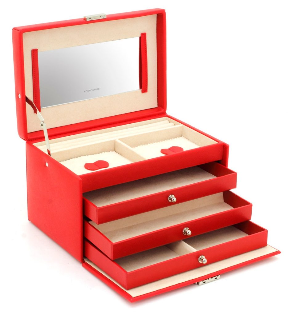 Červená šperkovnica Friedrich Lederwaren Jolie 2.0 23256-40 je vyrobená zo syntetickej kože. Vnútro je vyrobené z béžového velúru.