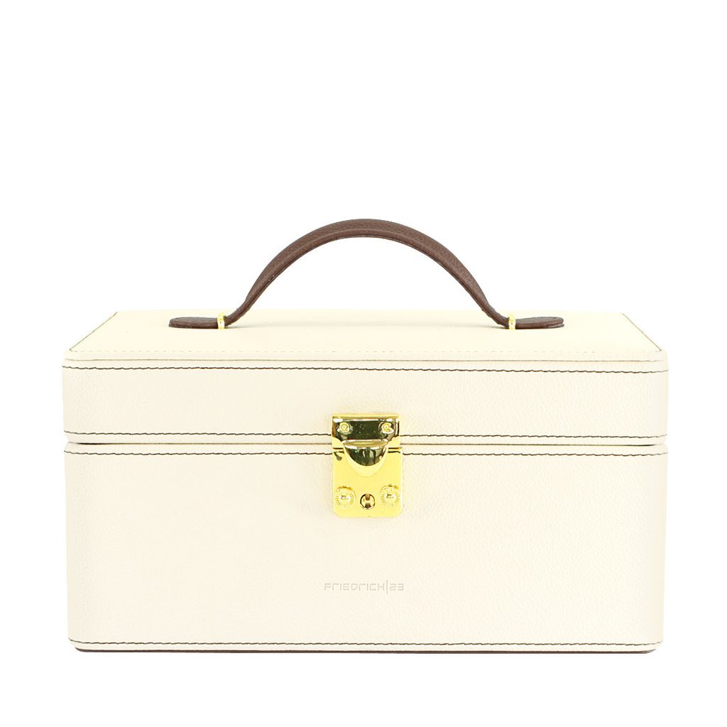 Šperkovnica Friedrich Lederwaren Ascot 20124-1 z bielej syntetickej kože s oranžovým velúrom, hnedým prešívaním a hnedou rukoväťou.