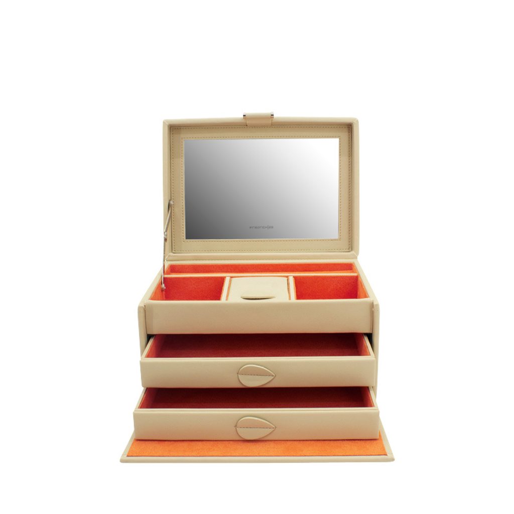 Obsahuje 3 poschodia na uloženie rôznych druhov šperkov, vo veku šperkovnice sa nachádza zrkadlo. Pod vekom sa nachádza priehradka na prstene a ďalšie dve priehradky s vankúšikmi na väčšie šperky. V spodnej časti sa nachádzajú ďalšie 2 zásuvky.