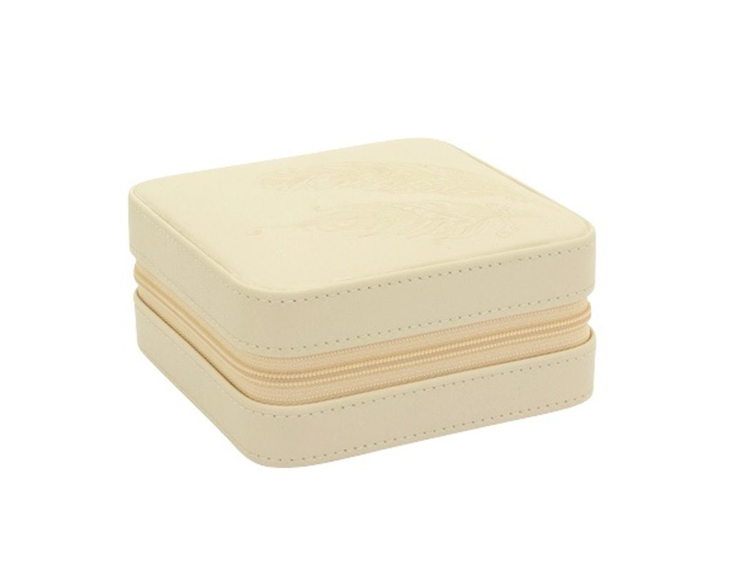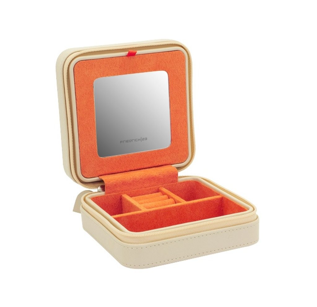 Béžová cestovná šperkovnica Friedrich Lederwaren Boho 20134-1 s oranžovým interiérom je vyrobená zo syntetickej kože. Na vrchnej strane škatuľky nájdeme vyrazené pierka.