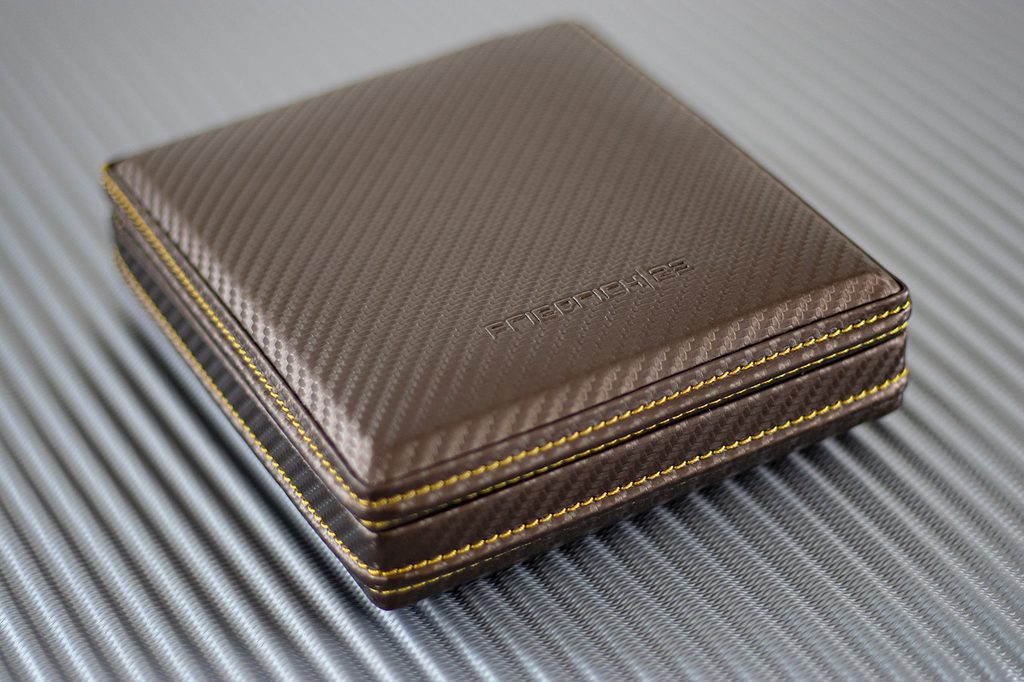 Hnedá šperkovnica Friedrich Lederwaren Cubano 27033-6 je vyrobená zo syntetickej kože s karbónovým vzorom.