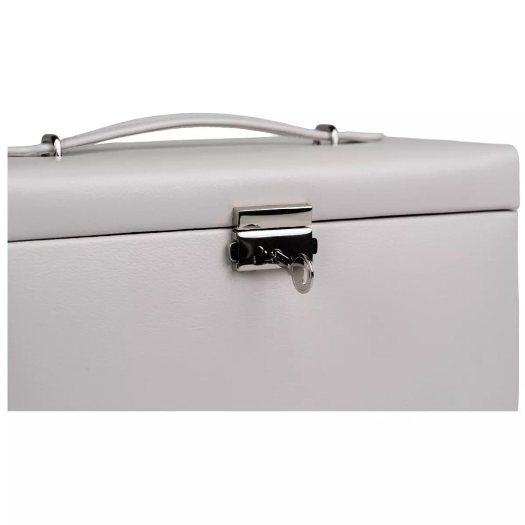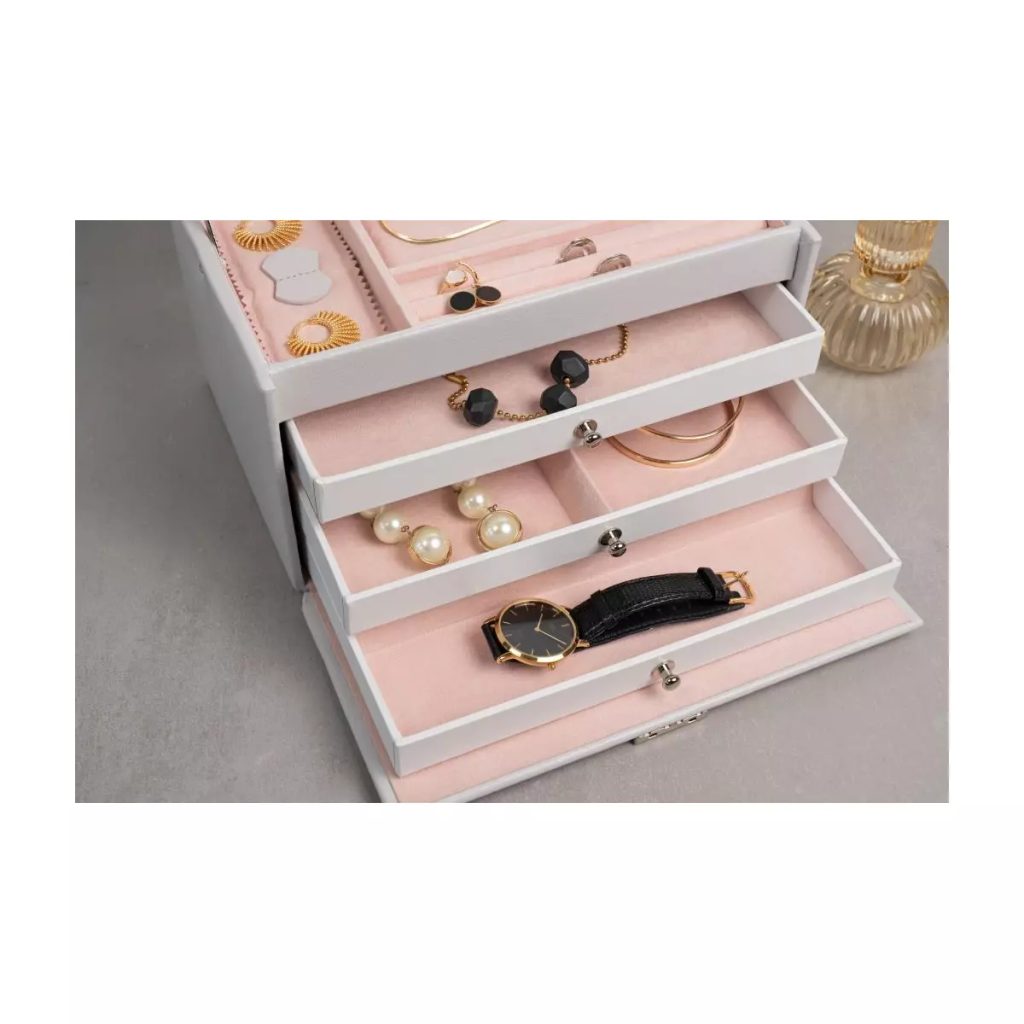 Nová edícia Classico Rosé spája klasické tvary s najlepším remeselným spracovaním. Jemná ružová vnútorná podšívka dodáva každému šperku nádych modernej ľahkosti a ženskej elegancie. Šperkovnica má 4 poschodia na uloženie rôznych typov šperkov. Zrkadlo a pásik na umiestnenie náušníc vo veku šperkovnice. Pod vekom sa nachádza priehradka na prstene a ďalšie dve priehradky s vankúšikmi na väčšie šperky. Potom sú tu ďalšie 3 priehradky. Šperkovnica je uzamykateľná.