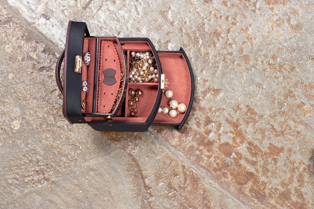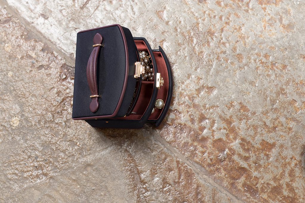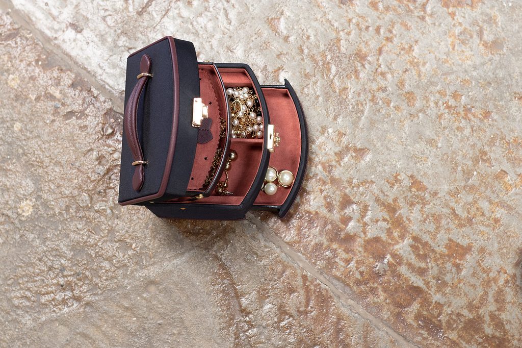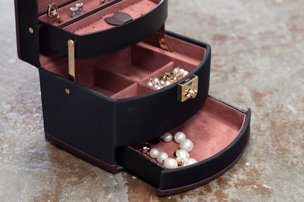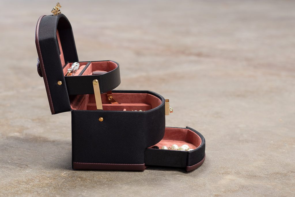 Obsahuje 3 úrovne na uloženie rôznych druhov šperkov s automatickou výsuvnou priehradkou. Zrkadlo sa nachádza na spodnej strane veka.