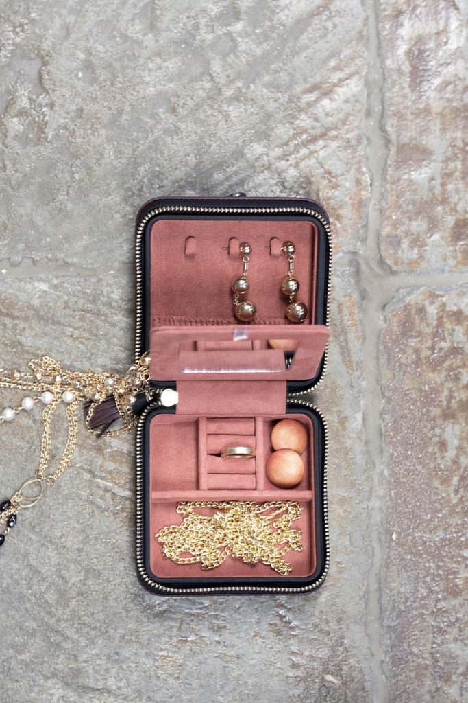 Obsahuje niekoľko priehradiek na uloženie šperkov. Pod zrkadlom sa nachádzajú úchyty na umiestnenie náušníc.