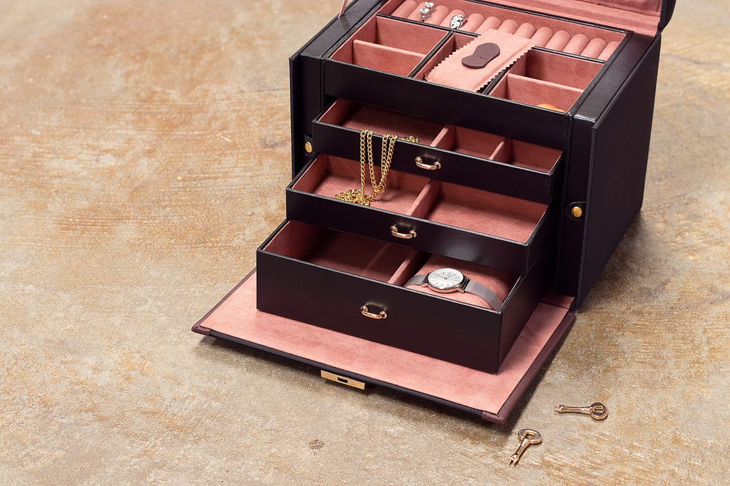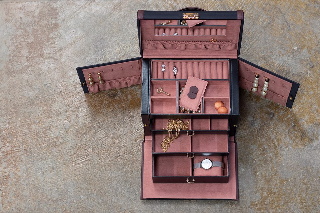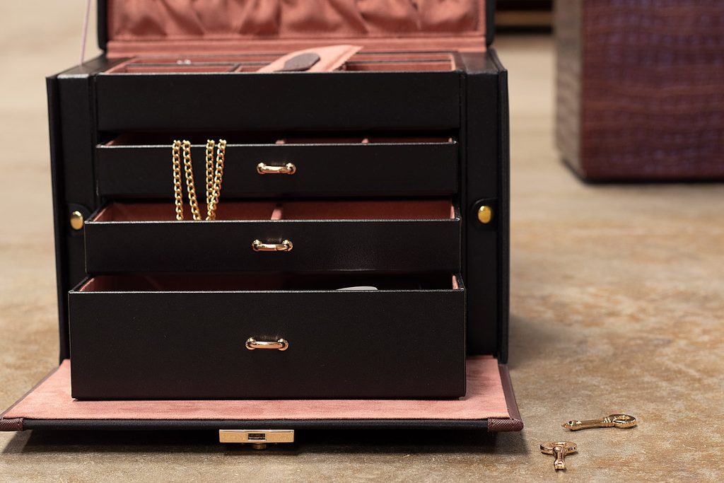 Pod vekom sa nachádza priehradka na prstene a niekoľko ďalších priehradiek na väčšie šperky. V spodnej časti sa nachádzajú 3 ďalšie zásuvky na uloženie šperkov alebo hodiniek. Šperkovnica je uzamykateľná.