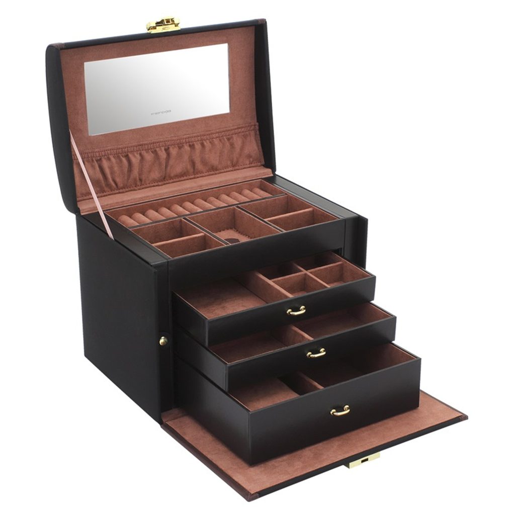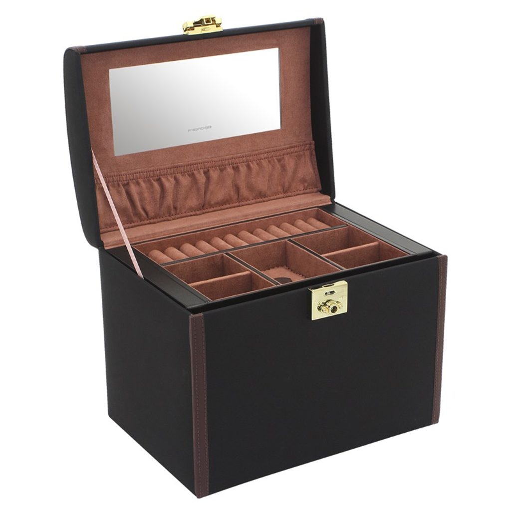 Čierna šperkovnica Friedrich Lederwaren Copenhagen 23337-2 je vyrobená z polyesteru. Obsahuje 4 poschodia na uloženie rôznych druhov šperkov, bočné strany sú otvárateľné a obsahujú úchyty na uloženie náušníc.