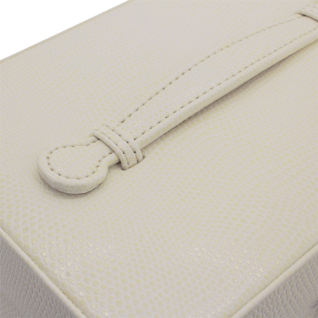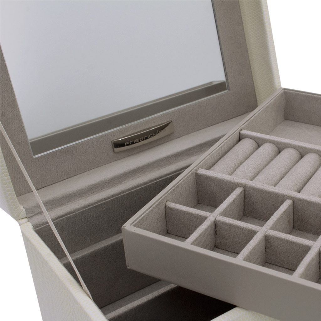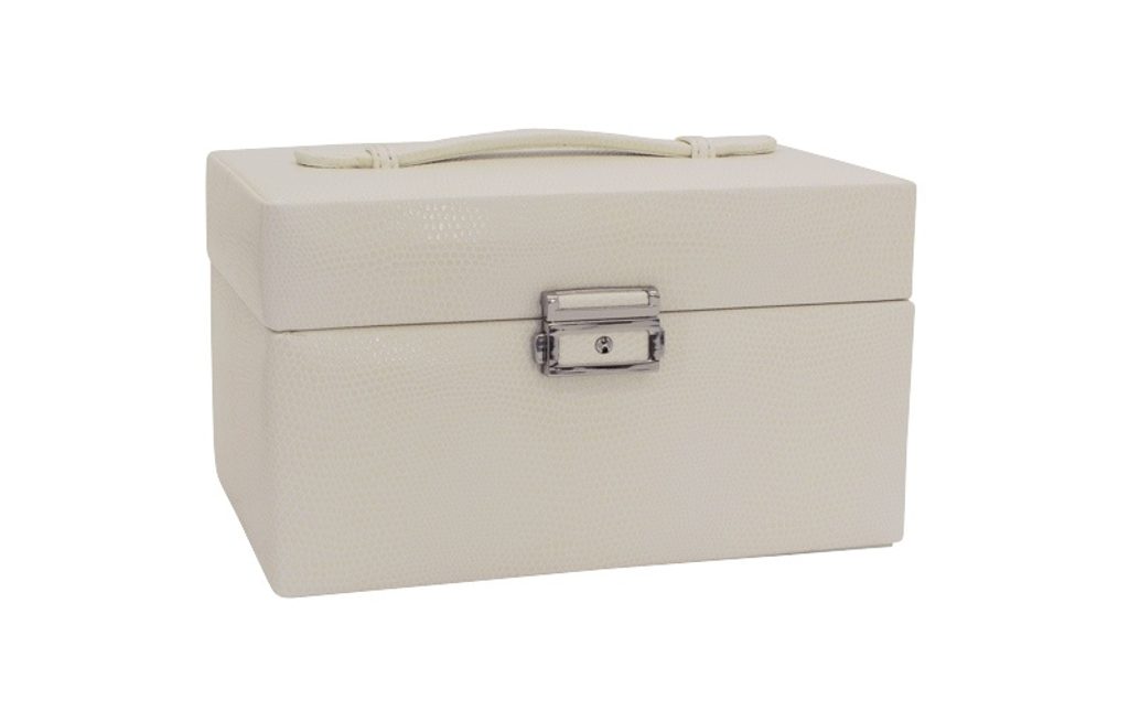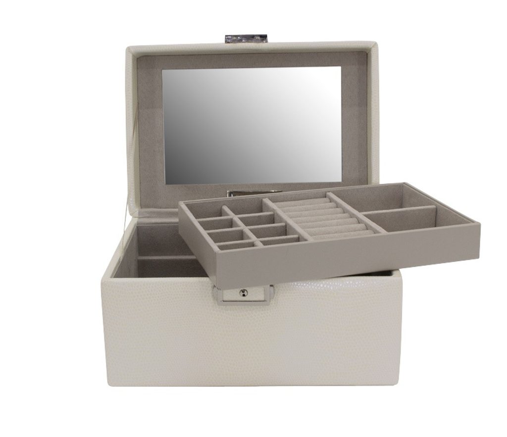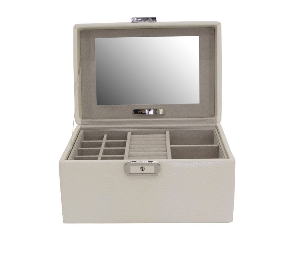 Perkovnica Friedrich Lederwaren Milano 20142-9 béžová je potiahnutá syntetickou kožou so vzorom jašterice. Obsahuje 2 poschodia na uloženie rôznych druhov šperkov, zrkadlo je na vnútornej strane uzatvárateľného veka.