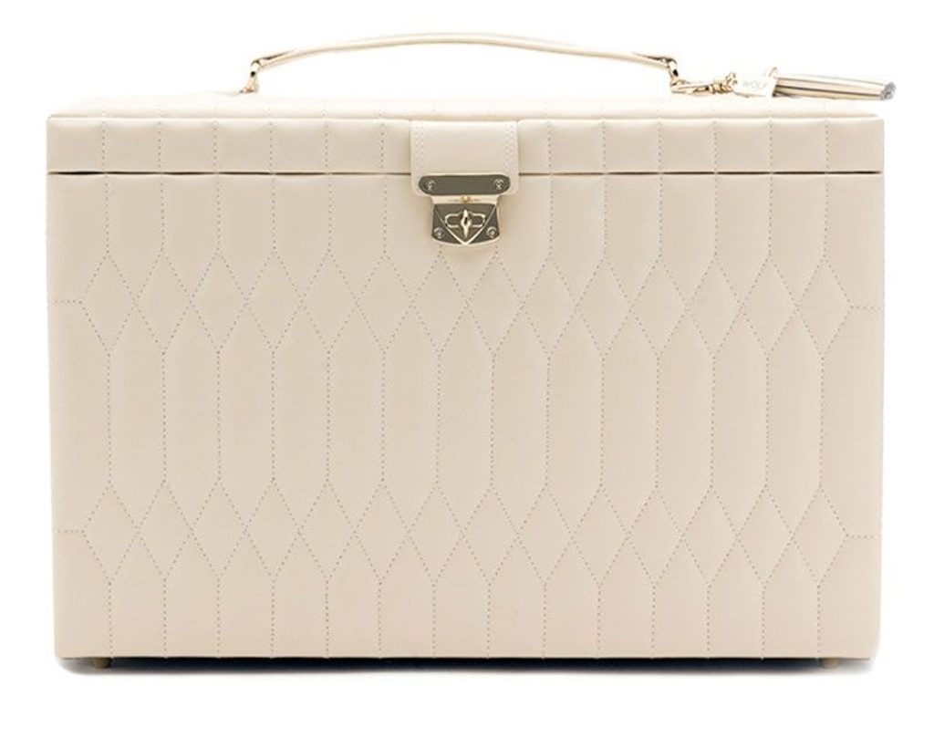 Extra veľká šperkovnica Wolf Caroline 329553 farba slonovej kosti s hnedým interiérom. Stelesnenie sofistikovanosti a štýlu. Extra veľká šperkovnica Caroline, nadčasová klasika s elegantnými jemnými líniami z 50. rokov, pružná koža prešitá diamantom zvýraznená zlatým kovaním. Toto rafinované puzdro je dokonalým úložným priestorom pre vaše vzácne šperky.
