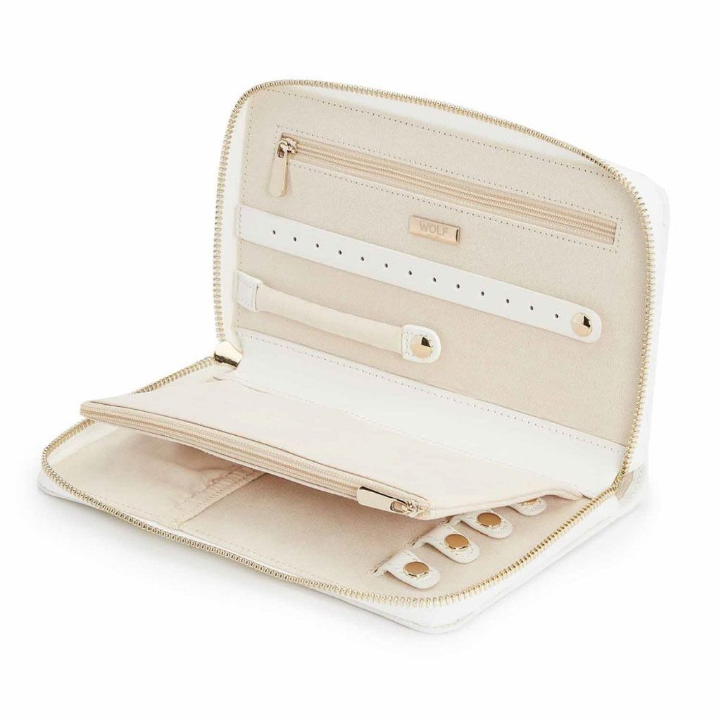 Cestovná šperkovnica Wolf Maria 766453 bielo-modrá s béžovým interiérom. Vyrobená z hladkej kože zvýraznenej zlatými farebnými detailmi. Dokonalá cestovná šperkovnica, ktorá sa zmestí do každej cestovnej tašky alebo dokonca kabelky.