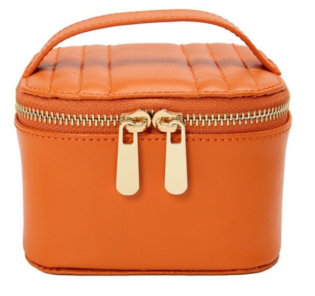 Cestovná šperkovnica Wolf Maria Cube 766539 oranžová s oranžovým interiérom. Vyrobená z hladkej kože so zlatým farebným akcentom. Dokonalá cestovná šperkovnica, ktorá sa zmestí do každej cestovnej tašky alebo dokonca kabelky.