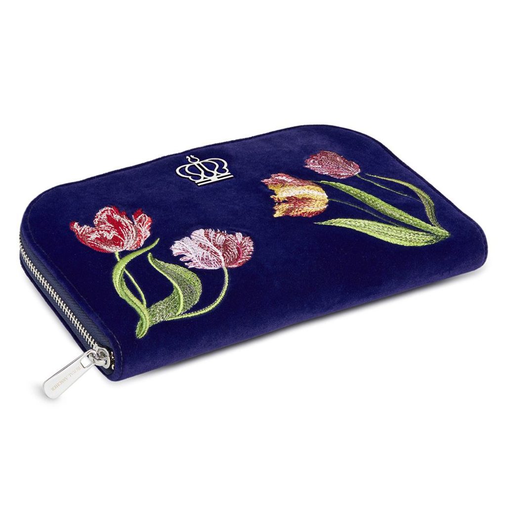 Šperkovnica Wolf Royal Asscher 394005 tmavomodrá s béžovým vnútrom. Šperkovnica je vyrobená v spolupráci so spoločnosťou Royal Asscher Diamond Company, ktorá sa zaoberá obchodovaním a spracovaním diamantov. Zamatová vonkajšia strana veľkej šperkovnice je bohato vyšívaná klasickými kvetinovými vzormi a je rovnako krásna ako jej príslušenstvo vo vnútri.